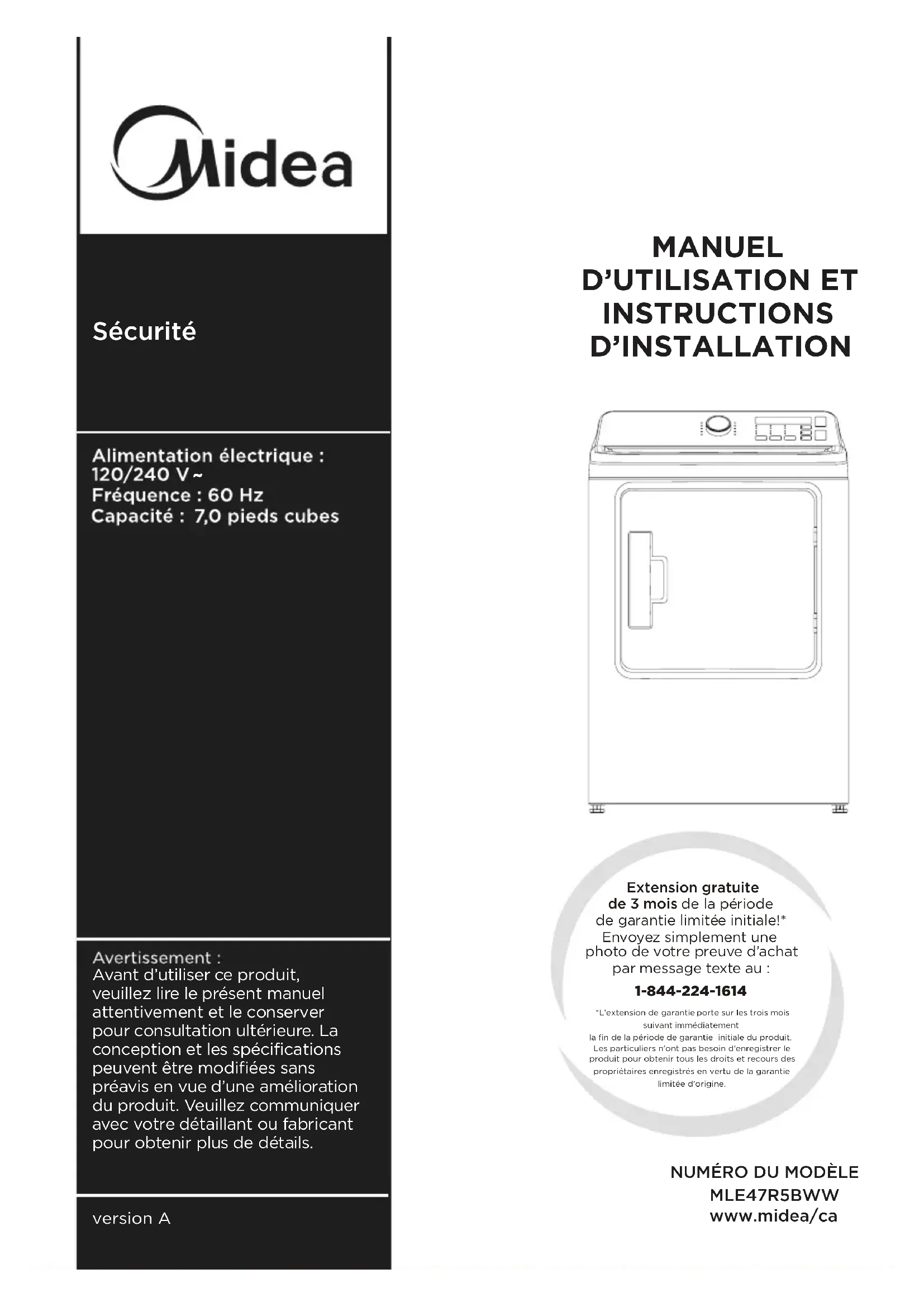 INSTRUCTIONS D’INSTALLATION MLE47R5BWWwww.midea/caExtension gratuite de 3 mois de la période de garantie limitée initiale!* Envoyez simplement une photo de votre preuve d’achat par message texte au : 1-844-224-1614 *L’extension de garantie porte sur les trois mois suivant immédiatement la fin de la période de garantie initiale du produit. Les particuliers n'ont pas besoin d'enregistrer le produit pour obtenir tous les droits et recours des propriétaires enregistrés en vertu de la garantie limitée d'origine.NUMÉRO DU MODÈLECher utilisateur MERCI et FÉLICITATIONS pour l’achat de ce produit Midea de haute qualité. Votre sécheuse Midea est conçue pour orir des performances et une fiabilité exceptionnelles. Veuillez prendre quelques minutes pour enregistrer votre nouvelle sécheuse. Veuillez enregistrer votre nouvelle sécheuse sur le site www.midea.com sous l’onglet Support (Soutien). Pour référence future, notez votre modèle de produit et les numéros de série, qui se trouvent dans le châssis intérieur de la sécheuse. Numéro de modèle_______________________________________ Numéro de série_________________________________________