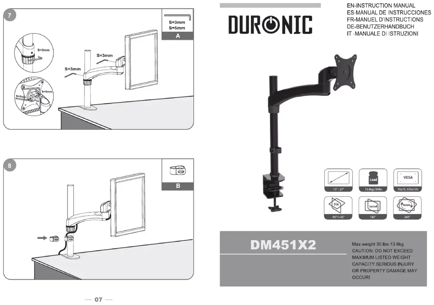 Le Duronic DM451X2 est compatible avec les écrans ayant un motif de montage VESA de 75 x 75 mm ou 100 x 100 mm.