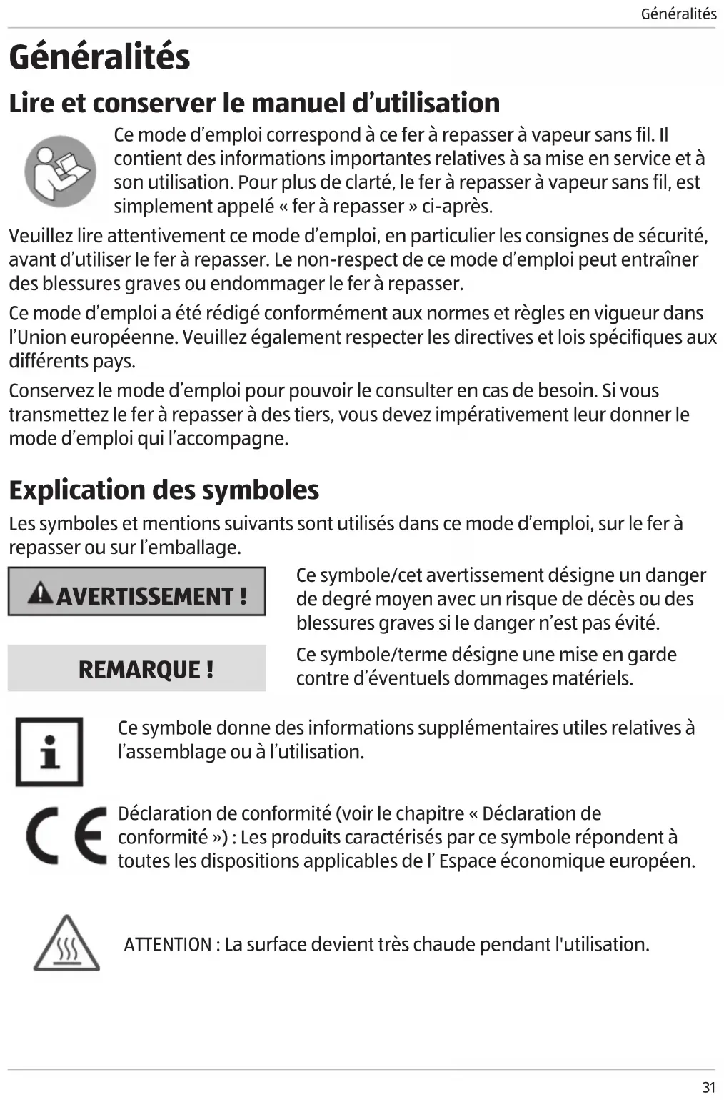 Généralités Lire et conserver le manuel d’utilisation Ce mode d’emploi correspond à ce fer à repasser à vapeur sans fil. Il contient des informations importantes relatives à sa mise en service et à son utilisation. Pour plus de clarté, le fer à repasser à vapeur sans fil, est simplement appelé «fer à repasser» ci-après. Veuillez lire attentivement ce mode d’emploi, en particulier les consignes de sécurité, avant d’utiliser le fer à repasser. Le non-respect de ce mode d’emploi peut entraîner des blessures graves ou endommager le fer à repasser. Ce mode d’emploi a été rédigé conformément aux normes et règles en vigueur dans l’Union européenne. Veuillez également respecter les directives et lois spécifiques aux différents pays. Conservez le mode d’emploi pour pouvoir le consulter en cas de besoin. Si vous transmettez le fer à repasser à des tiers, vous devez impérativement leur donner le mode d’emploi qui l’accompagne. Explication des symboles Les symboles et mentions suivants sont utilisés dans ce mode d’emploi, sur le fer à repasser ou sur l’emballage. AVERTISSEMENT! Ce symbole/cet avertissement désigne un danger de degré moyen avec un risque de décès ou des blessures graves si le danger n’est pas évité. REMARQUE! Ce symbole/terme désigne une mise en garde contre d’éventuels dommages matériels. Ce symbole donne des informations supplémentaires utiles relatives à l’assemblage ou à l’utilisation. Déclaration de conformité (voir le chapitre «Déclaration de conformité»): Les produits caractérisés par ce symbole répondent à toutes les dispositions applicables de l’ Espace économique européen. ATTENTION: La surface devient très chaude pendant l'utilisation.Sécurité