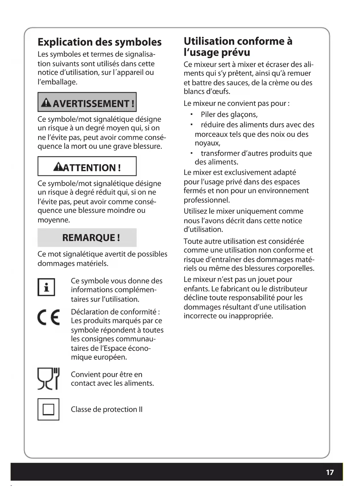 - Recyclage Sécurité Lire et conserver la notice d‘utilisation Lisez les instructions suivantes avec attention et conservez la notice afin de pouvoir la relire ultérieurement si nécessaire. Joignez la notice d‘utili- sation si vous remettez cet appareil à une autre personne. Druckbuch Stabmixer BEL.indb 16Druckbuch Stabmixer BEL.indb 16 23.06.2023 08:39:1223.06.2023 08:39:1217 Explication des symboles Les symboles et termes de signalisa- tion suivants sont utilisés dans cette notice d’utilisation, sur l´appareil ou l’emballage. AVERTISSEMENT ! Ce symbole/mot signalétique désigne un risque à un degré moyen qui, si on ne l’évite pas, peut avoir comme consé- quence la mort ou une grave blessure. ATTENTION ! Ce symbole/mot signalétique désigne un risque à degré réduit qui, si on ne l’évite pas, peut avoir comme consé- quence une blessure moindre ou moyenne. REMARQUE ! Ce mot signalétique avertit de possibles dommages matériels. Ce symbole vous donne des informations complémen- taires sur l’utilisation. Déclaration de conformité : Les produits marqués par ce symbole répondent à toutes les consignes communau- taires de l’Espace écono- mique européen. Convient pour être en contact avec les aliments. Classe de protection II Utilisation conforme à l‘usage prévu Ce mixeur sert à mixer et écraser des ali- ments qui s’y prêtent, ainsi qu’à remuer et battre des sauces, de la crème ou des blancs d’œufs. Le mixeur ne convient pas pour : Piler des glaçons, réduire des aliments durs avec des morceaux tels que des noix ou des noyaux, transformer d’autres produits que des aliments. Le mixer est exclusivement adapté pour l’usage privé dans des espaces fermés et non pour un environnement professionnel. Utilisez le mixer uniquement comme nous l’avons décrit dans cette notice d’utilisation. Toute autre utilisation est considérée comme une utilisation non conforme et risque d’entraîner des dommages maté- riels ou même des blessures corporelles. Le mixeur n’est pas un jouet pour enfants. Le fabricant ou le distributeur décline toute responsabilité pour les dommages résultant d’une utilisation incorrecte ou inappropriée. Druckbuch Stabmixer BEL.indb 17Druckbuch Stabmixer BEL.indb 17 23.06.2023 08:39:1223.06.2023 08:39:1218 Consignes de sécurité AVERTISSEMENT ! Risque d’électrocution ! Une installation électrique défectueuse, une tension de réseau trop élevée et une manipulation inappropriée d’un appareil électrique peuvent provoquer des chocs électriques. Pour mixer et battre, le presse-purée et le fouet peuvent être plongés dans des liquides. N’immergez jamais l’appareil ainsi que le câble et la fiche d’alimentation dans l’eau ou dans tout autre liquide pour éviter tout risque d’électrocution. N’utilisez jamais l’appareil dans un environnement humide ou dans un environnement présentant une forte humidité de l’air. Raccordez l’appareil à une prise ins- tallée de manière conforme dont la tension est conforme aux « données techniques ». Veillez à ce que la prise soit bien accessible pour que vous puissiez la retirer rapidement de la fiche murale en cas de besoin. N’utilisez pas le mixeur si l’appareil, le câble de raccordement ou la fiche secteur sont endommagés ou si l’appareil est tombé, en cas de vices apparents ou de fuites. Assurez-vous que le câble électrique n‘est pas endommagé par des arêtes vives ou des objets chauds. Ne manipulez pas le mixeur avec des mains mouillées. Retirez la fiche secteur de la prise de courant si vous n’utilisez pas le mixeur, avant de nettoyer l’appareil, de le déplacer ou de le ranger et en cas de dysfonctionnement pendant l’utilisation ou pendant un orage. Tirez toujours sur la fiche secteur et non pas sur le câble. Ne pas enrouler le câble de raccor- dement autour de l’appareil ou de parties de l’appareil. Un mauvais enroulement peut endommager l’isolation du câble et entraîner un risque de choc électrique. N’utilisez pas de câble de prolonga- tion. Ne modifiez pas l‘appareil ou le câble d’alimentation. Confiez les réparations exclusivement à un ate- lier spécialisé. Respectez les condi- tions de garantie. Si le mixeur, le câble d’alimentation ou la fiche secteur sont endomma- gés, faites-les réparer par le fabricant ou par un atelier spécialisé pour éviter les dangers. N‘utilisez pas cet appareil près de baignoires, de piscines, de bacs de douche ou d‘autres récipients contenant de l‘eau. Risque d’électro- cution ! Le mixeur doit toujours être débran- ché lorsqu’il n’est pas sous sur- veillance et avant l’assemblage, le démontage ou le nettoyage. Consultez le chapitre « Nettoyage » pour savoir comment nettoyer les surfaces en contact avec les ali- ments. AVERTISSEMENT ! Risques pour les enfants et per- sonnes à capacités physiques, sen- sorielles ou mentales réduites (par exemple, les personnes souffrant d’un handicap, les personnes âgées aux capacités physiques et mentales Druckbuch Stabmixer BEL.indb 18Druckbuch Stabmixer BEL.indb 18 23.06.2023 08:39:1223.06.2023 08:39:1219 p. 29
