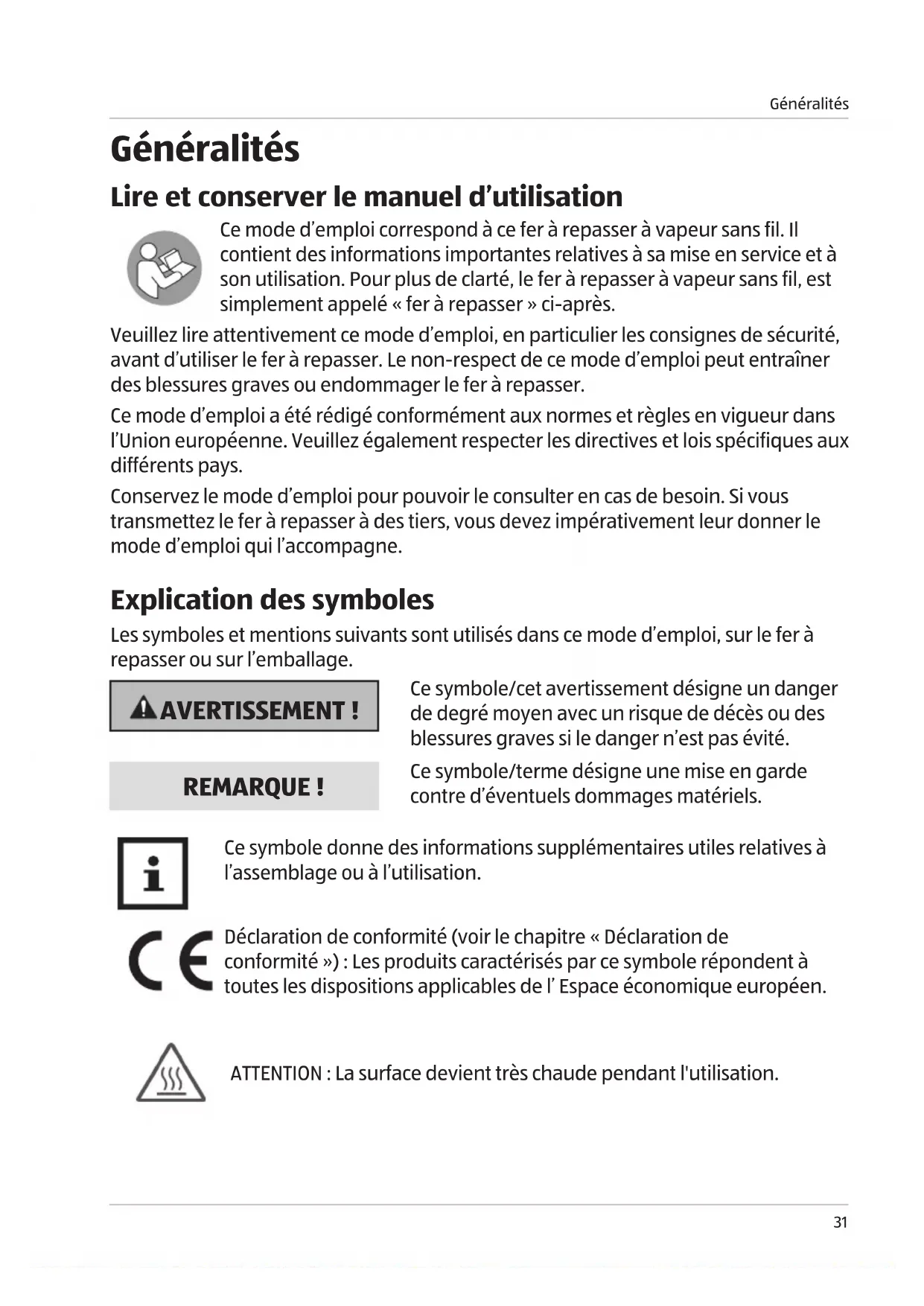 Généralités Lire et conserver le manuel d’utilisation Ce mode d’emploi correspond à ce fer à repasser à vapeur sans fil. Il contient des informations importantes relatives à sa mise en service et à son utilisation. Pour plus de clarté, le fer à repasser à vapeur sans fil, est simplement appelé «fer à repasser» ci-après. Veuillez lire attentivement ce mode d’emploi, en particulier les consignes de sécurité, avant d’utiliser le fer à repasser. Le non-respect de ce mode d’emploi peut entraîner des blessures graves ou endommager le fer à repasser. Ce mode d’emploi a été rédigé conformément aux normes et règles en vigueur dans l’Union européenne. Veuillez également respecter les directives et lois spécifiques aux différents pays. Conservez le mode d’emploi pour pouvoir le consulter en cas de besoin. Si vous transmettez le fer à repasser à des tiers, vous devez impérativement leur donner le mode d’emploi qui l’accompagne. Explication des symboles Les symboles et mentions suivants sont utilisés dans ce mode d’emploi, sur le fer à repasser ou sur l’emballage. AVERTISSEMENT! Ce symbole/cet avertissement désigne un danger de degré moyen avec un risque de décès ou des blessures graves si le danger n’est pas évité. REMARQUE! Ce symbole/terme désigne une mise en garde contre d’éventuels dommages matériels. Ce symbole donne des informations supplémentaires utiles relatives à l’assemblage ou à l’utilisation. Déclaration de conformité (voir le chapitre «Déclaration de conformité»): Les produits caractérisés par ce symbole répondent à toutes les dispositions applicables de l’ Espace économique européen. ATTENTION: La surface devient très chaude pendant l'utilisation.Sécurité