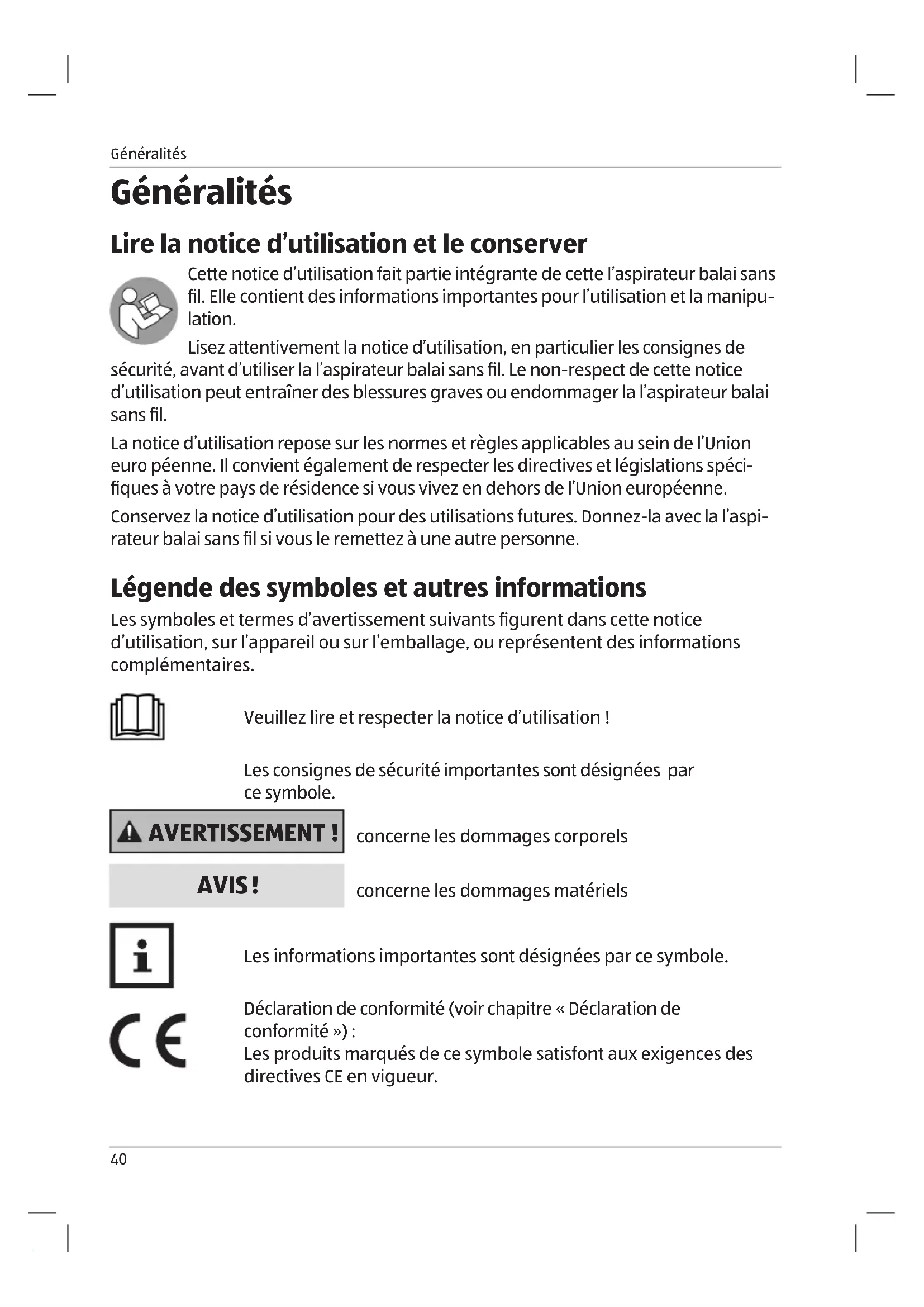 - Lire la notice d’utilisation et le conserver p. 40