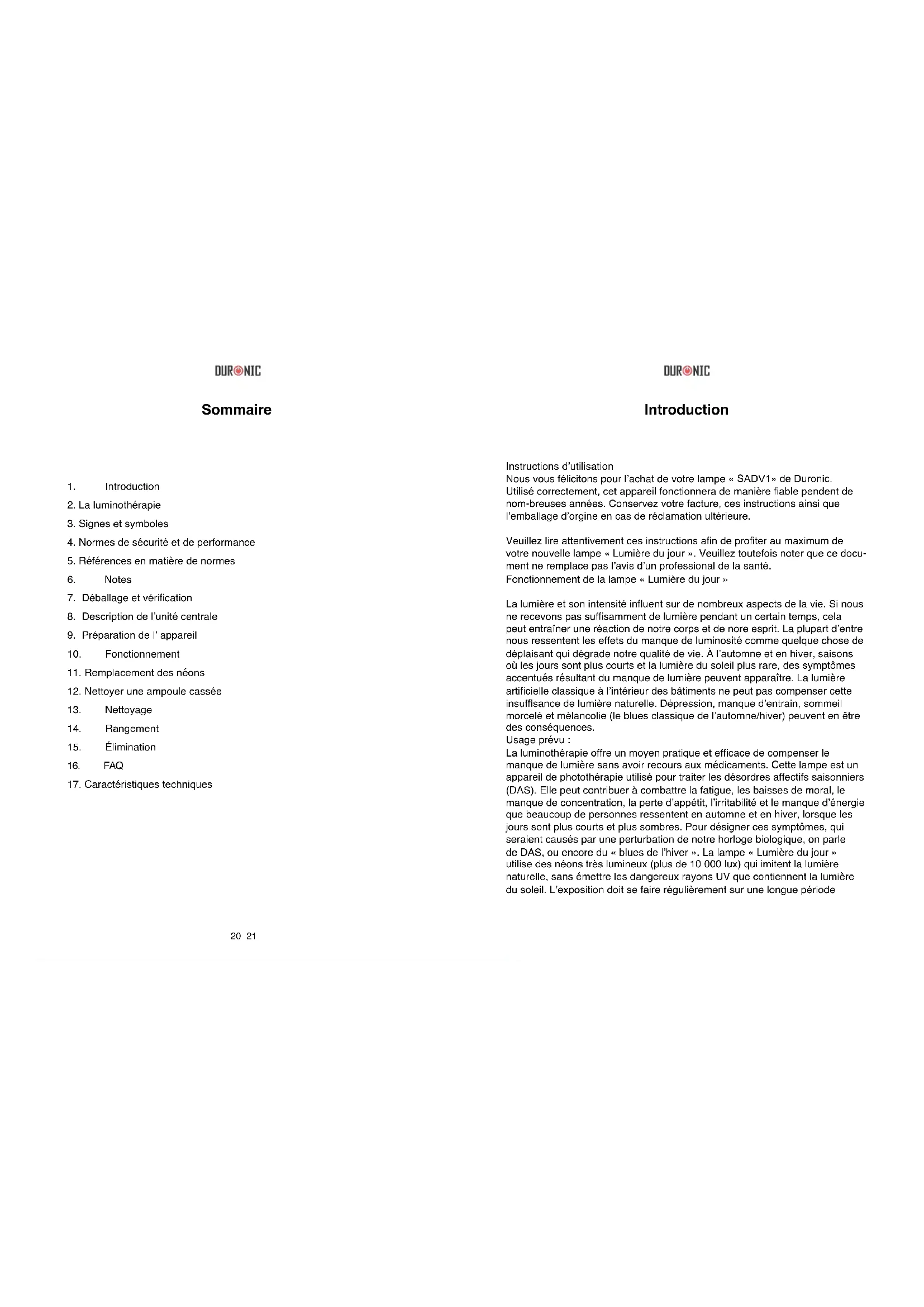 Introduction Instructionsd’utilisation Nousvousfélicitonspourl’achatdevotrelampe«SADV1» de Duronic. Utilisécorrectement,cetappareilfonctionnerademanièrefiablependentde nom-breusesannées.Conservezvotrefacture,cesinstructionsainsique l’emballaged’orgineencasderéclamationultérieure. Veuillezlireattentivementcesinstructionsandeproteraumaximumde votrenouvellelampe«Lumièredujour».Veuilleztoutefoisnoterquecedocu- mentneremplacepasl’avisd’unprofessionaldelasanté. Fonctionnementdelalampe«Lumièredujour» Lalumièreetsonintensitéinuentsurdenombreuxaspectsdelavie.Sinous nerecevonspassufsammentdelumièrependantuncertaintemps,cela peutentraîneruneréactiondenotrecorpsetdenoreesprit.Laplupartd’entre nous ressentent les effets du manque de luminosité comme quelque chose de déplaisantquidégradenotrequalitédevie.Àl’automneetenhiver,saisons où les jours sont plus courts et la lumière du soleil plus rare, des symptômes accentués résultant du manque de lumière peuvent apparaître. La lumière articielleclassiqueàl’intérieurdesbâtimentsnepeutpascompensercette insufsancedelumièrenaturelle.Dépression,manqued’entrain,sommeil morceléetmélancolie(lebluesclassiquedel’automne/hiver)peuventenêtre des conséquences. Usage prévu : Laluminothérapieoffreunmoyenpratiqueetefcacedecompenserle manque de lumière sans avoir recours aux médicaments. Cette lampe est un appareil de photothérapie utilisé pour traiter les désordres affectifs saisonniers (DAS).Ellepeutcontribueràcombattrelafatigue,lesbaissesdemoral,le manquedeconcentration,laperted’appétit,l’irritabilitéetlemanqued’énergie que beaucoup de personnes ressentent en automne et en hiver, lorsque les jours sont plus courts et plus sombres. Pour désigner ces symptômes, qui seraient causés par une perturbation de notre horloge biologique, on parle deDAS,ouencoredu«bluesdel’hiver».Lalampe«Lumièredujour» utilise des néons très lumineux (plus de 10 000 lux) qui imitent la lumière naturelle, sans émettre les dangereux rayons UV que contiennent la lumière dusoleil.L’expositiondoitsefairerégulièrementsurunelonguepériode22 23 (quotidiennement pendant au moins une semaine). La lumière est captée par lesyeuxetdoitdansl’idéalêtreabsorbéetôtdanslajournée,enplusdela lumièrenaturelleetdel’éclairagearticiel.Toutefois,iln’estpasnécessairede regarderdirectementlalampependanttouteladuréedel’exposition. Laduréedel’expositiondépenddevotrepositionetdeladistancequivous sépare de la source lumineuse. Plus votre visage est proche de la lampe, plus letempsd’expositionestcourt.Vouspouvezallumervotrelampe« Lumière dujour»pendantquevouslisez,écrivez,téléphonezoutravaillezpar exemple.Assurez-vouscependantd’êtretoujourssuffisammentprochedela lampe.