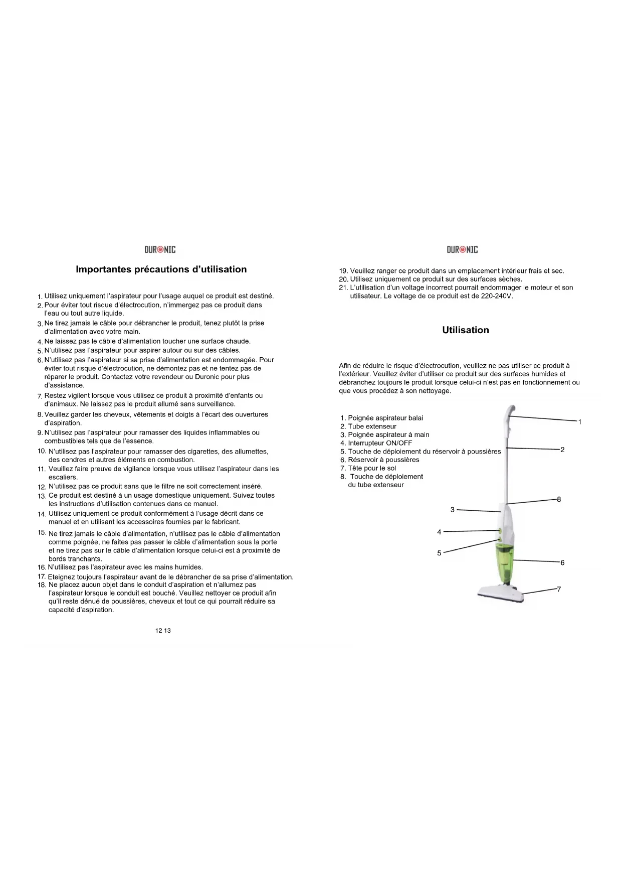 Retrouvez gratuitement la notice de l'appareil VC8 Duronic au format PDF.