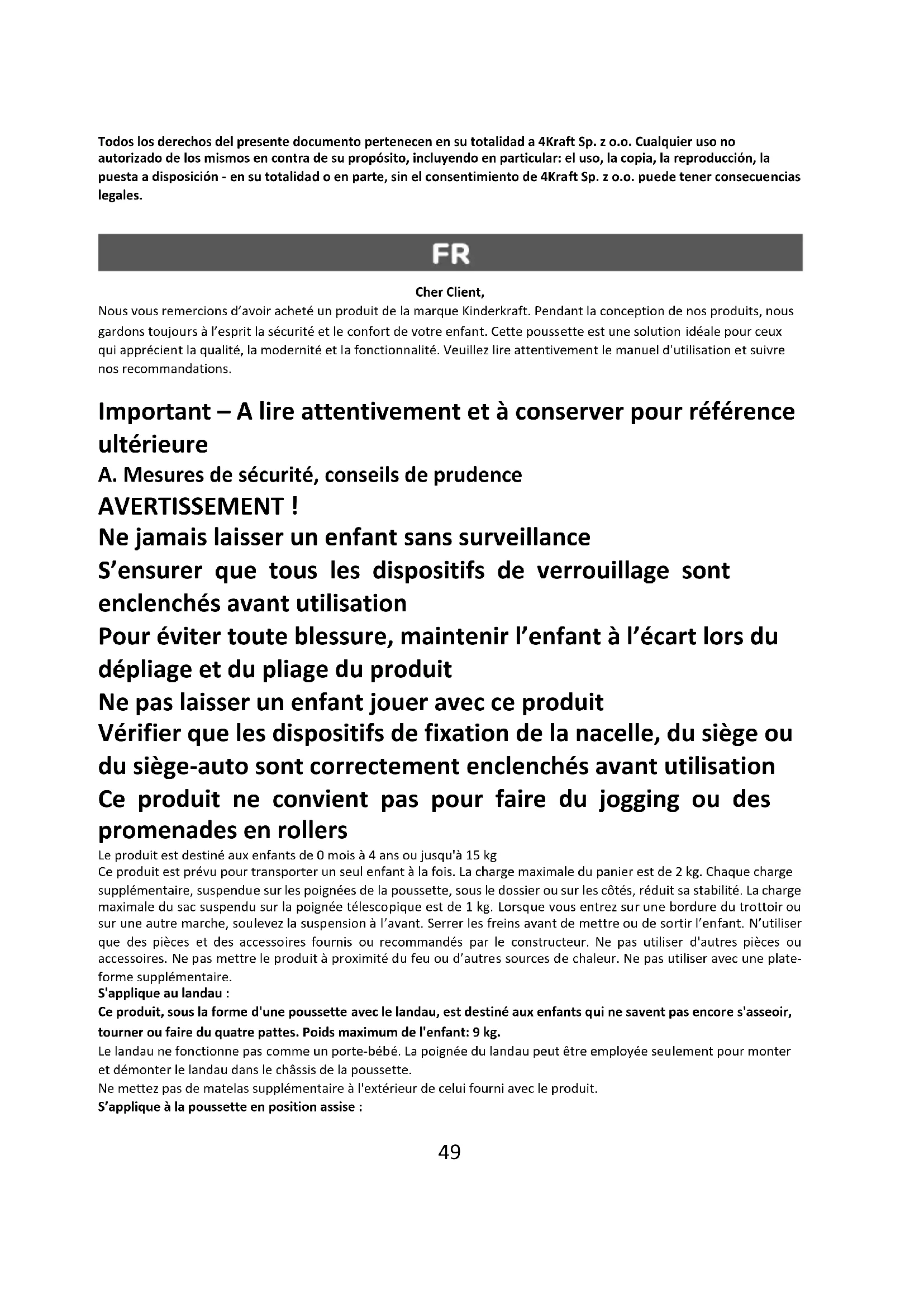 Todos los derechos del presente documento pertenecen en su totalidad a 4Kraft Sp. z o.o. Cualquier uso no autorizado de los mismos en contra de su propósito, incluyendo en particular: el uso, la copia, la reproducción, la puesta a disposición - en su totalidad o en parte, sin el consentimiento de 4Kraft Sp. z o.o. puede tener consecuencias legales. Cher Client, Nous vous remercions d’avoir acheté un produit de la marque Kinderkraft. Pendant la conception de nos produits, nous gardons toujours à l’esprit la sécurité et le confort de votre enfant. Cette poussette est une solution idéale pour ceux qui apprécient la qualité, la modernité et la fonctionnalité. Veuillez lire attentivement le manuel d'utilisation et suivre nos recommandations. Important – A lire attentivement et à conserver pour référence ultérieure A. Mesures de sécurité, conseils de prudence AVERTISSEMENT ! Ne jamais laisser un enfant sans surveillance S’ensurer que tous les dispositifs de verrouillage sont enclenchés avant utilisation Pour éviter toute blessure, maintenir l’enfant à l’écart lors du dépliage et du pliage du produit Ne pas laisser un enfant jouer avec ce produit Vérifier que les dispositifs de fixation de la nacelle, du siège ou du siège-auto sont correctement enclenchés avant utilisation Ce produit ne convient pas pour faire du jogging ou des promenades en rollers Le produit est destiné aux enfants de 0 mois à 4 ans ou jusqu'à 15 kg Ce produit est prévu pour transporter un seul enfant à la fois. La charge maximale du panier est de 2 kg. Chaque charge supplémentaire, suspendue sur les poignées de la poussette, sous le dossier ou sur les côtés, réduit sa stabilité. La charge maximale du sac suspendu sur la poignée télescopique est de 1 kg. Lorsque vous entrez sur une bordure du trottoir ou sur une autre marche, soulevez la suspension à l’avant. Serrer les freins avant de mettre ou de sortir l’enfant. N’utiliser que des pièces et des accessoires fournis ou recommandés par le constructeur. Ne pas utiliser d'autres pièces ou accessoires. Ne pas mettre le produit à proximité du feu ou d’autres sources de chaleur. Ne pas utiliser avec une plate- forme supplémentaire. S'applique au landau : Ce produit, sous la forme d'une poussette avec le landau, est destiné aux enfants qui ne savent pas encore s'asseoir, tourner ou faire du quatre pattes. Poids maximum de l'enfant: 9 kg. Le landau ne fonctionne pas comme un porte-bébé. La poignée du landau peut être employée seulement pour monter et démonter le landau dans le châssis de la poussette. Ne mettez pas de matelas supplémentaire à l'extérieur de celui fourni avec le produit. S’applique à la poussette en position assise :50 AVERTISSEMENT ! Ce siège ne convient pas à des enfants de moins de 6 mois Toujours utiliser le système de retenue Le produit est destiné aux enfants de 6 mois à 15 kg. S’applique au cosy Kinderkraft MINK : La poussette Kinderkraft VEO peut être offerte avec un cosy compatible, Kinderkraft MINK. Le produit est destiné aux enfants de 0 mois à 13 kg. Le cosy utilisé avec la poussette ne remplace pas un berceau ou un lit. Si votre enfant a besoin de sommeil, il devrait être déplacé vers une nacelle, un berceau ou un lit. I Éléments de la poussette A. Le châssis B. Les roues avant C. Les roues arrière D. L’essieu arrière avec le frein E. Le support de sécurité F. Le siège / landau 2en1 G. Le pare-soleil/auvent H. Les ceintures de sécurité