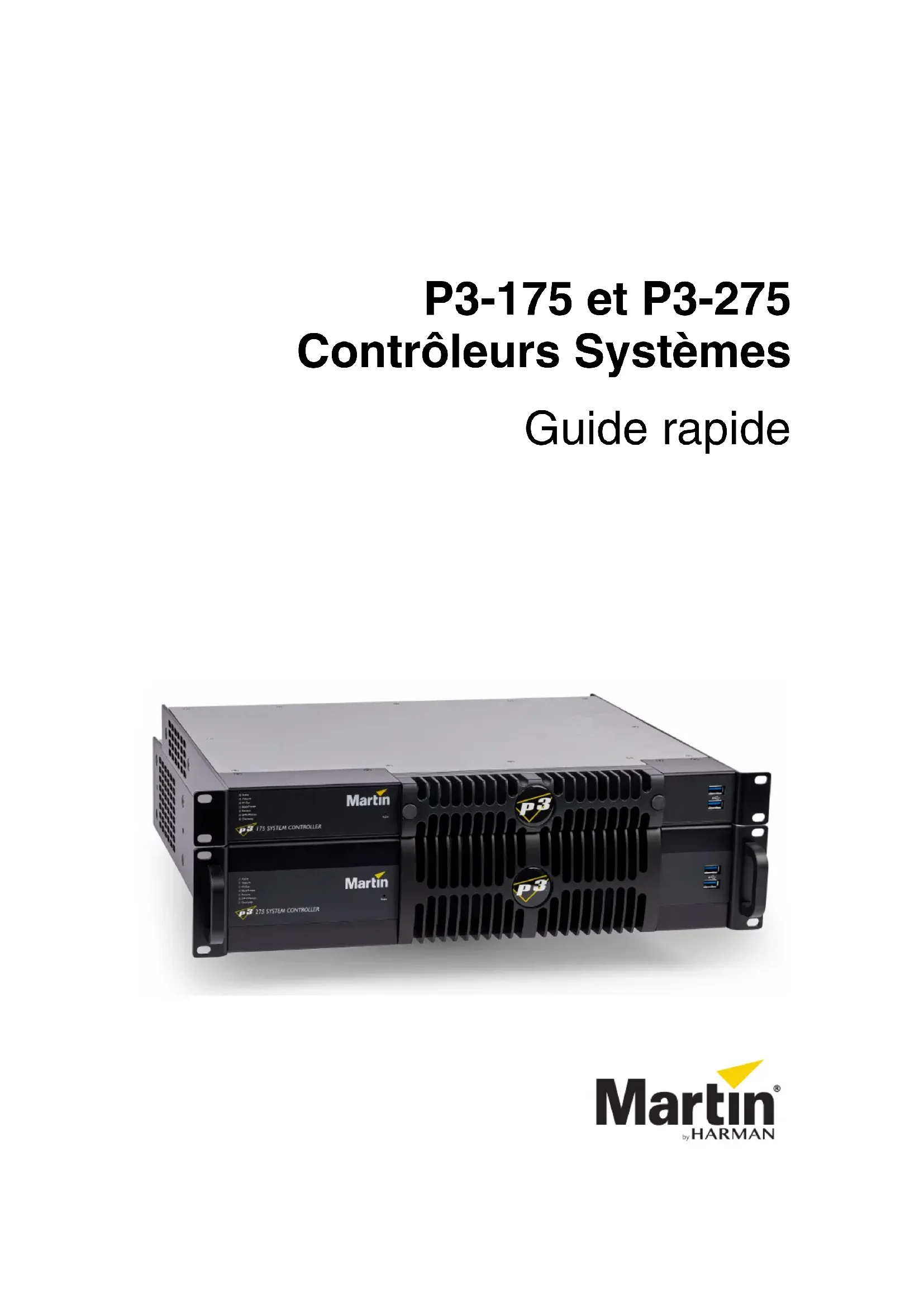 - Rack 19’’ 1U Rack 19’’ 2U ©2022-2023 HARMAN PROFESSIONAL DENMARK ApS. Tous droits réservés. Les caractéristiques, les spécifications et l’aspect sont susceptibles d’être modifiés sans préavis. HARMAN PROFESSIONAL DENMARK ApS et ses filiales déclinent toute responsabilité en cas de blessure, de dommage, de perte directe ou indirecte, de perte consécutive, ou de préjudice économique ou de toute autre nature liés à l’utilisation ou à l’impossibilité d’utiliser l’équipement, ou à la non-fiabilité des informations contenues dans ce document. Martin est une marque déposée de HARMAN PROFESSIONAL DENMARK ApS enregistrée aux États-Unis et/ou dans d’autres pays.HARMAN PROFESSIONAL DENMARK ApS , Olof Palmes Allé 44, 8200 Aarhus N, Denmark HARMAN PROFESSIONAL SOLUTIONS U.S. , 8500 Balboa Blvd., Northridge CA 91329, USA www.martin.comContrôleurs Système P3-175 et P3-275, Guide rapide, Français, Rev. ATable des matières Dimensions p. 2