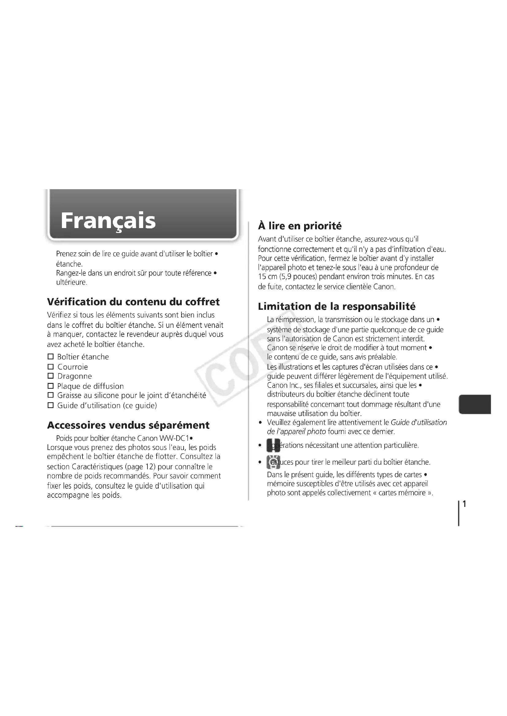 Guide d’utilisation (ce guide) Accessoires vendus séparément Poids pour boîtier étanche Canon WW-DC1• Lorsque vous prenez des photos sous l'eau, les poids empêchent le boîtier étanche de flotter. Consultez la section Caractéristiques (page 12) pour connaître le nombre de poids recommandés. Pour savoir comment fixer les poids, consultez le guide d'utilisation qui accompagne les poids. COPY2 Précautions de sécurité Avant d'utiliser le boîtier étanche, veuillez lire attentivement • les précautions de sécurité exposées ci-après. Veillez à toujours utiliser le boîtier étanche de manière appropriée. Les précautions de sécurité reprises aux pages suivantes • ont pour but d'éviter tout risque de dommages corporels et matériels. Avertissement Indique un risque de blessure grave ou de mort. Attention Indique un risque de blessure. Attention Indique un risque de dommages pour le boîtier étanche et l’appareil photo. Avertissement Assurez-vous de bien retirer l'appareil photo après avoir utilisé le boîtier étanche. Si vous laissez le boîtier étanche contenant l'appareil photo sous la lumière directe du soleil ou dans un endroit où la température est élevée, cela pourrait entraîner un incendie ou le boîtier pourrait éclater. N'utilisez pas le boîtier étanche comme un dispositif flottant (par exemple, bouée de sauvetage). N’utilisez pas la courroie sous l'eau. Enlevez la courroie et fixez la dragonne avant d'utiliser le boîtier étanche sous l'eau. La courroie pourrait s’enrouler autour du cou et présenter ainsi un risque d'étranglement ou autre blessure. Attention Si le boîtier étanche présente une infiltration d'eau, éteignez immédiatement l'appareil photo. Une infiltration risque d'occasionner un incendie ou une décharge électrique. Essuyez l'intérieur du boîtier étanche et l'appareil photo jusqu'à ce qu'ils soient secs et contactez le service clientèle Canon. Attention Soyez attentif à la présence de condensation. Déplacer trop rapidement le boîtier étanche d'un endroit chaud vers un endroit froid peut entraîner la formation de condensation (gouttelettes d'eau) sur les surfaces intérieures, susceptible de nuire au fonctionnement. Cessez d'utiliser l'appareil photo si vous décelez de la condensation. Retirez l'appareil photo et essuyez la condensation du boîtier et de l'appareil avec un chiffon doux et sec jusqu'à ce qu’ils soient complètement secs. COPY3 Ne placez pas l'appareil photo dans le boîtier avec • la dragonne. N'appuyez pas trop fort sur les touches et le levier • quand le boîtier est immergé. Ne vaporisez pas d'eau du robinet sur le joint • d'étanchéité. Prenez soin de ne pas abîmer le joint d'étanchéité et • veillez à ne pas laisser de saletés se déposer entre le joint et le boîtier. Ne démontez pas et ne modifiez pas le boîtier étanche.• Les actions précitées peuvent provoquer des infiltrations. Évitez d'utiliser ou de ranger le boîtier étanche dans les lieux suivants : Profondeur supérieure • à 40 mètres (130 pieds). Endroits susceptibles d'atteindre • des températures supérieures à 40 °C (104 °F). Évitez de déposer ou de ranger le boîtier étanche dans les lieux suivants : Endroits directement exposés • aux rayons du soleil. Endroits humides ou poussiéreux.• À proximité de substances • telles que la naphtaline ou des insecticides. Ne faites pas tomber et ne jetez pas le boîtier étanche. Les actions précitées pourraient déformer le boîtier et provoquer un dysfonctionnement. Utilisez uniquement la graisse au silicone fournie. L'emploi d'autres produits d'étanchéité pourrait amoindrir la résistance du boîtier étanche. Joint d'étanchéité Des corps étrangers collés sur le joint d'étanchéité peuvent • entraîner des infiltrations d'eau. La présence d'un minuscule grain de sable ou d’un cheveu sur le joint peut entraîner des infiltrations d'eau. Si vous constatez que le joint d'étanchéité est abîmé ou • fissuré, arrêtez immédiatement d'utiliser le boîtier et contactez le service clientèle Canon. Rangez soigneusement le boîtier étanche en le laissant • entrouvert pour éviter une déformation de son joint d'étanchéité et pour préserver ses performances d'étanchéité. Protégez le joint d'étanchéité de la poussière et des • éraflures pendant les périodes d'inactivité. Pour garantir l'étanchéité du boîtier, il est recommandé de remplacer le joint une fois par an. Pour le remplacement du joint, contactez le service • clientèle Canon. COPY4 Guide des composants Touche vidéo Touche ON/OFF Molette modes Touche