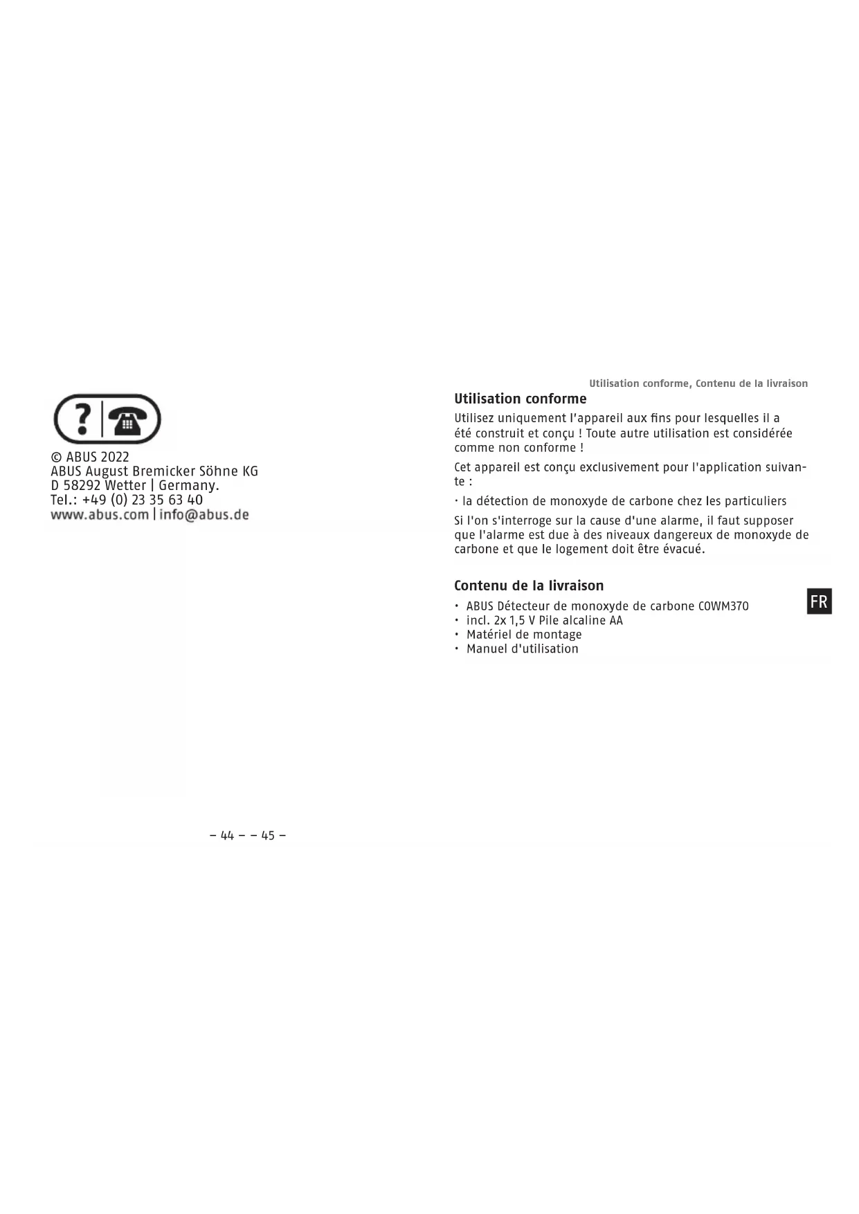 - Le détecteur de CO ABUS COWM370 est conçu et homologué conformément à EN 50291 uniquement pour la détection du CO (monoxyde de carbone) chez les particuliers ! FR– 50 – – 51 –