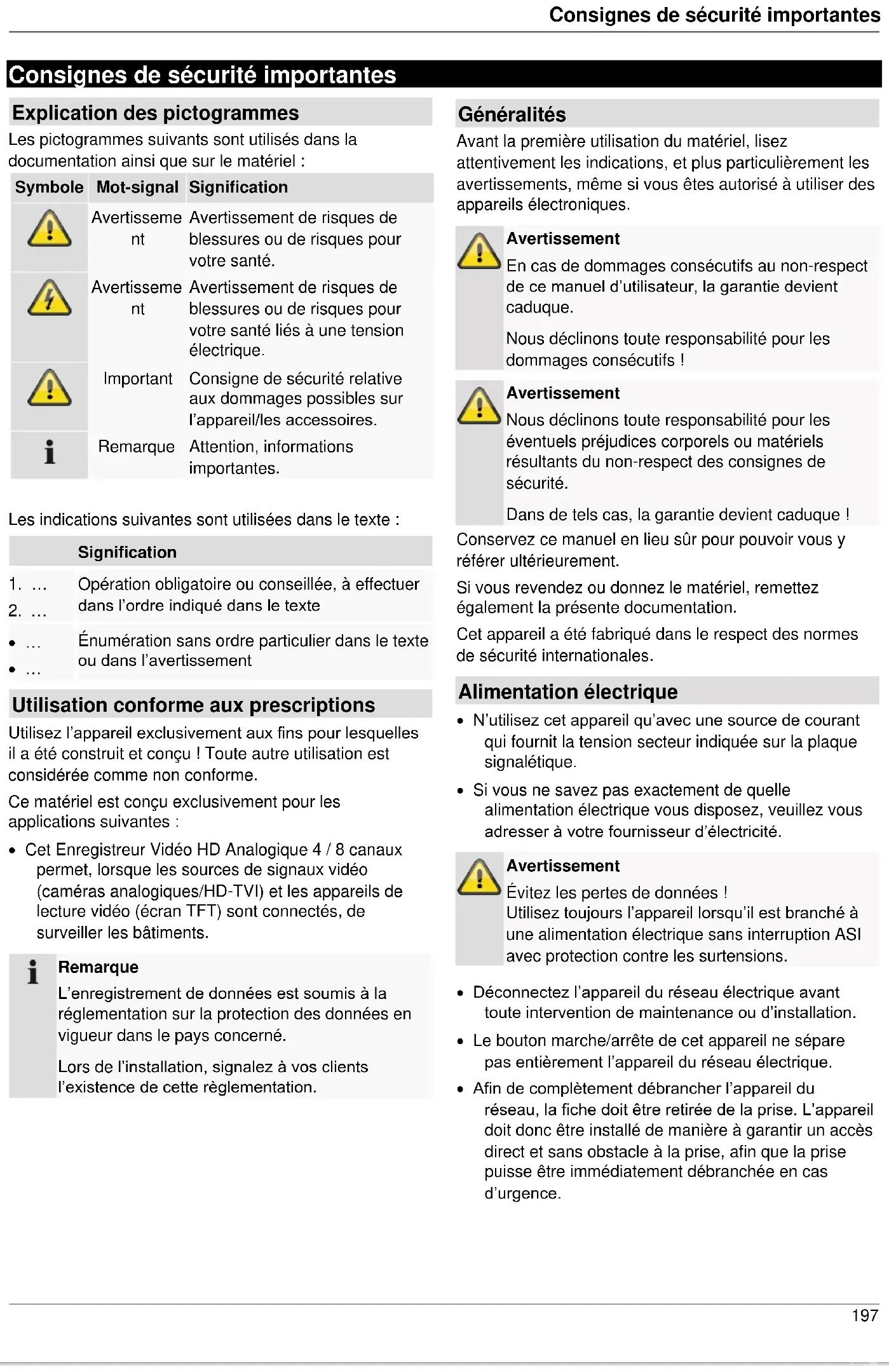 Énumération sans ordre particulier dans le texte ou dans l’avertissement Utilisation conforme aux prescriptions Utilisez l’appareil exclusivement aux fins pour lesquelles il a été construit et conçu ! Toute autre utilisation est considérée comme non conforme. Ce matériel est conçu exclusivement pour les applications suivantes : Cet Enregistreur Vidéo HD Analogique 4 / 8 canaux permet, lorsque les sources de signaux vidéo (caméras analogiques/HD-TVI) et les appareils de lecture vidéo (écran TFT) sont connectés, de surveiller les bâtiments.