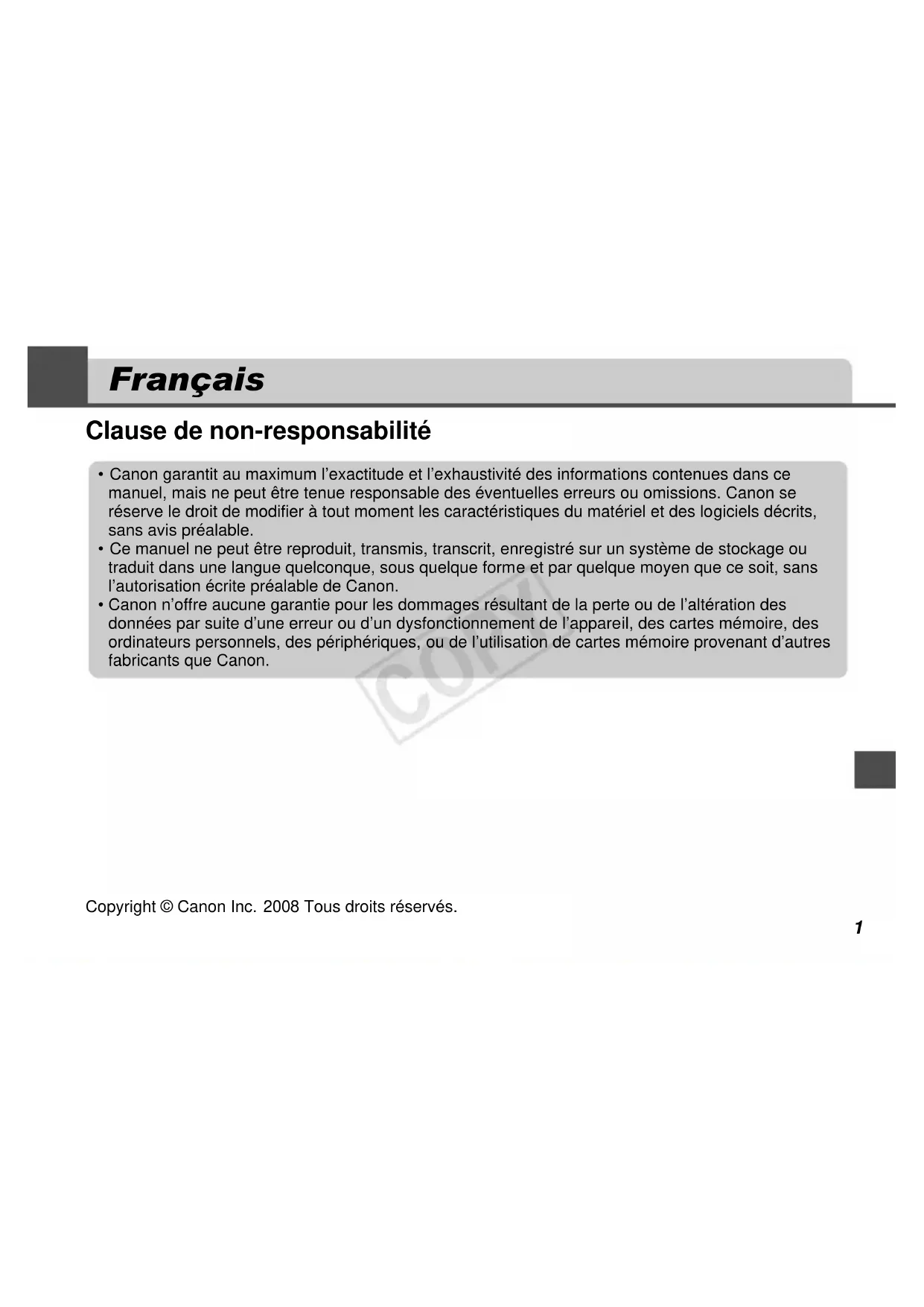 - Canon garantit au maximum l’exactitude et l’exhaustivité des informations contenues dans ce manuel, mais ne peut être tenue responsable des éventuelles erreurs ou omissions. Canon se réserve le droit de modifier à tout moment les caractéristiques du matériel et des logiciels décrits, sans avis préalable.