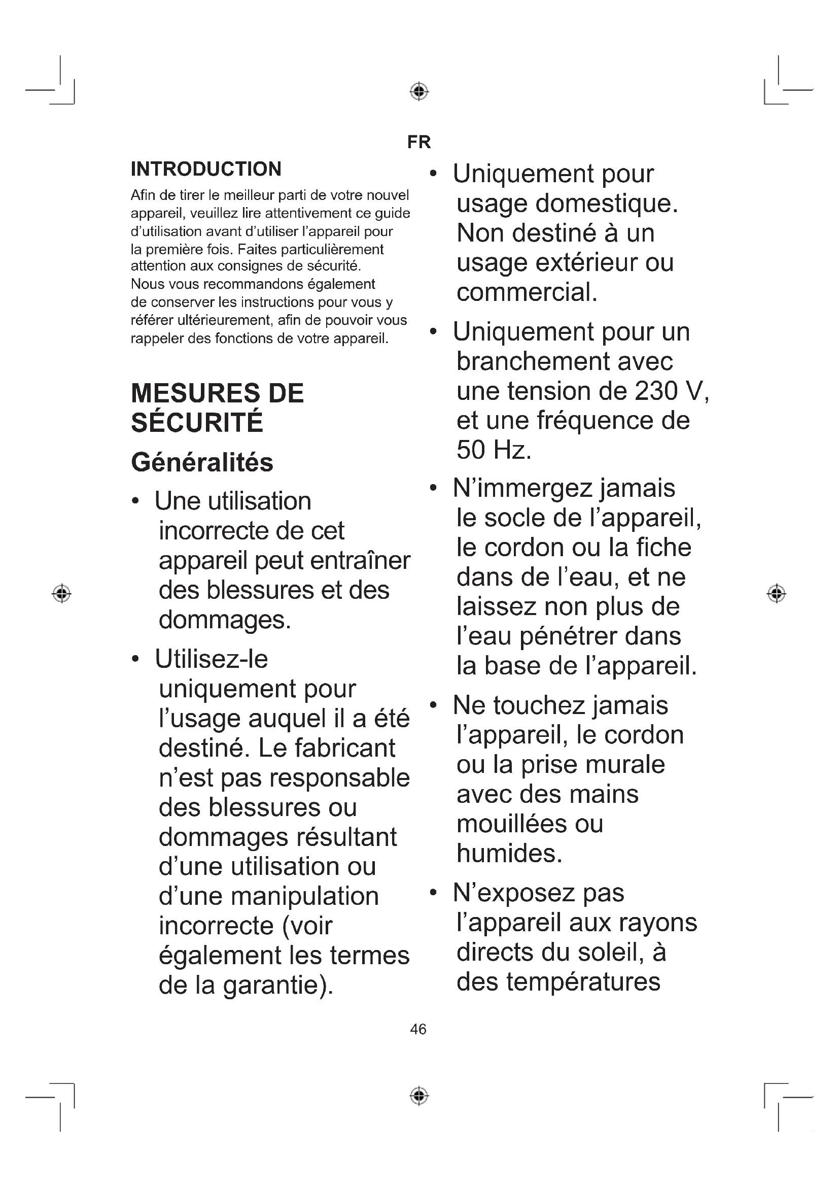 INTRODUCTION Afin de tirer le meilleur parti de votre nouvel appareil, veuillez lire attentivement ce guide d’utilisation avant d’utiliser l’appareil pour la première fois. Faites particulièrement attention aux consignes de sécurité. Nous vous recommandons également de conserver les instructions pour vous y référer ultérieurement, afin de pouvoir vous rappeler des fonctions de votre appareil. MESURES DE SÉCURITÉ Généralités