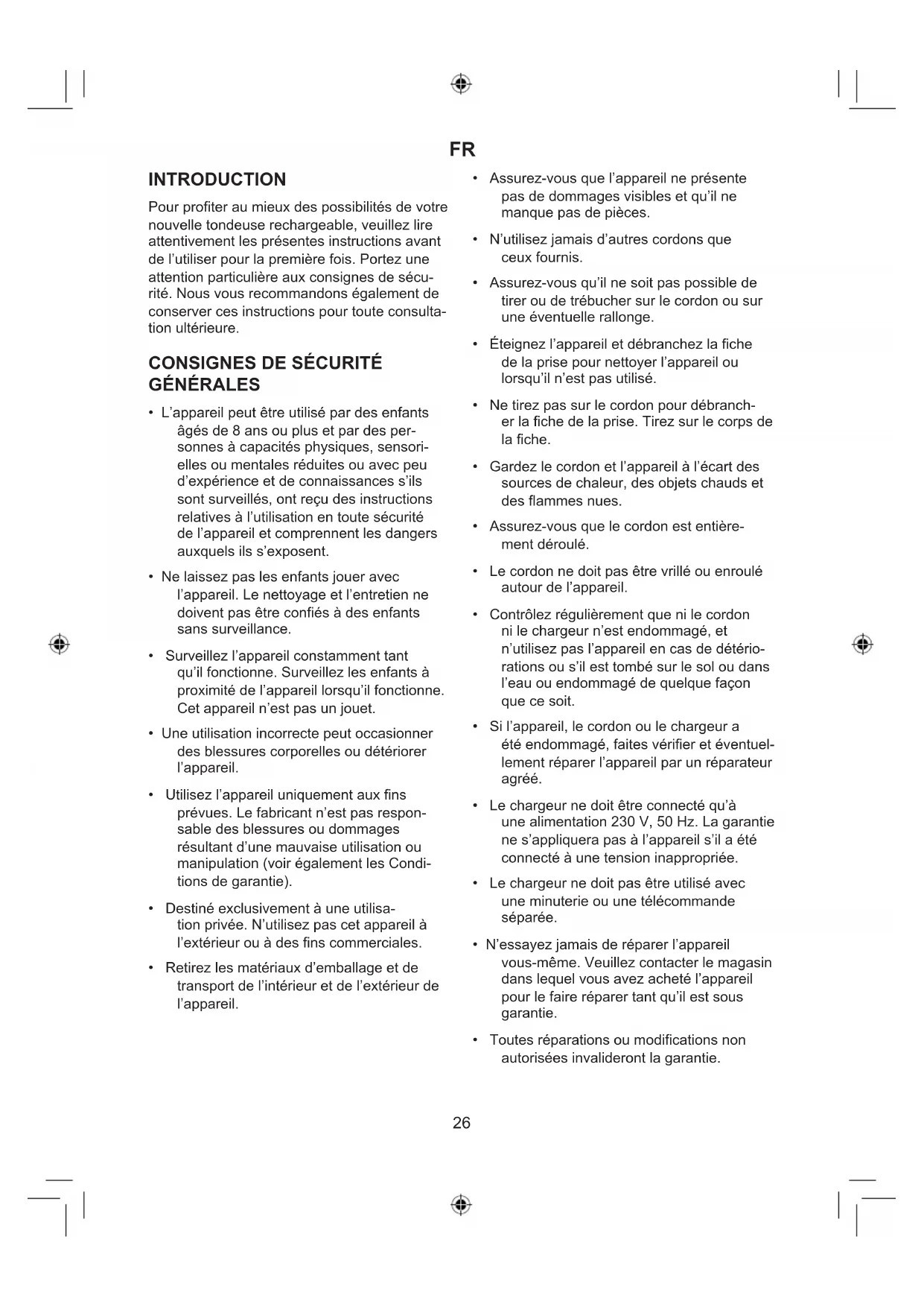 INTRODUCTION Pour profiter au mieux des possibilités de votre nouvelle tondeuse rechargeable, veuillez lire attentivement les présentes instructions avant de l’utiliser pour la première fois. Portez une attention particulière aux consignes de sécu- rité. Nous vous recommandons également de conserver ces instructions pour toute consulta- tion ultérieure.