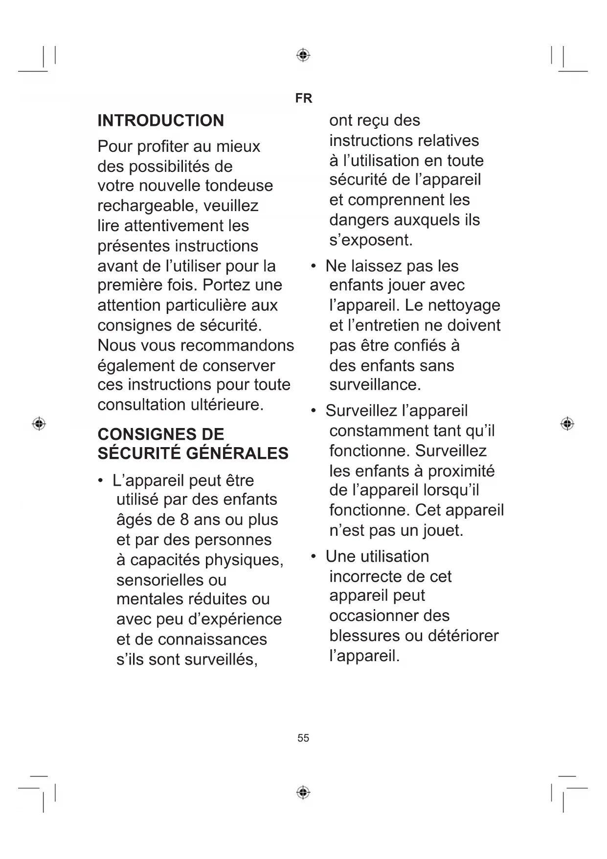 INTRODUCTION Pour profiter au mieux des possibilités de votre nouvelle tondeuse rechargeable, veuillez lire attentivement les présentes instructions avant de l’utiliser pour la première fois. Portez une attention particulière aux consignes de sécurité. Nous vous recommandons également de conserver ces instructions pour toute consultation ultérieure. CONSIGNES DE