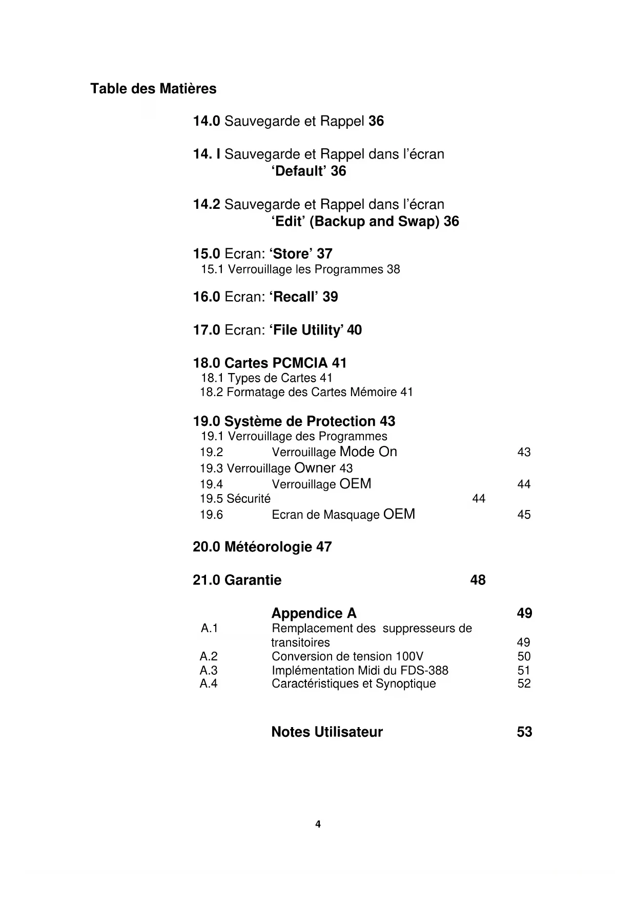 Appendice A 49 A.1 Remplacement des suppresseurs de transitoires 49 A.2 Conversion de tension 100V 50 A.3 Implémentation Midi du FDS-388 51 A.4 Caractéristiques et Synoptique 52 Notes Utilisateur 535