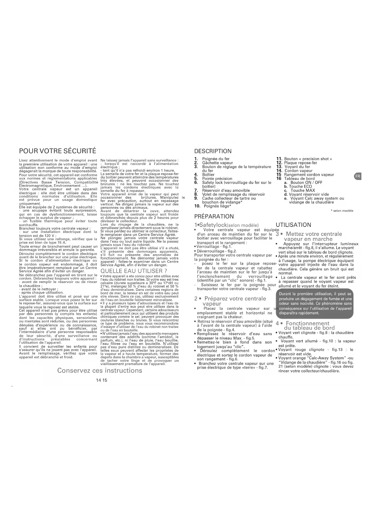 - N’utilisez jamais l’eau des appareils menagers contenant des additifs (comme l’amidon, le parfum, etc.), ni l’eau de pluie, l’eau bouillie, l’eau filtree ou l’eau en bouteille. N’utilisez pas d’eau pure distillee ou demineralisee. De telles eaux peuvent affecter les proprietes de la vapeur et a haute temperature, former des depots dans la chambre a vapeur, susceptibles de tacher votre linge et de provoquer un vieillissement premature de l’appareil. Conservez ces instructions 1 • Safety lock (selon modèle)