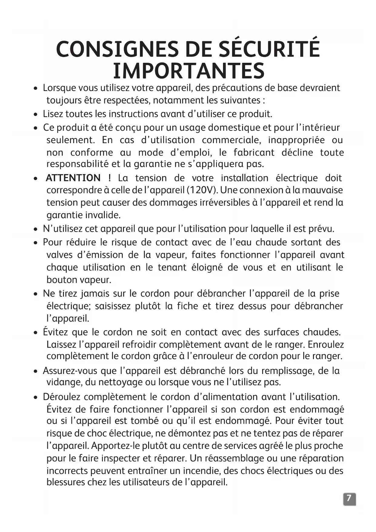 - Pour réduire le risque de contact avec de l’eau chaude sortant des valves d’émission de la vapeur, faites fonctionner l’appareil avant chaque utilisation en le tenant éloigné de vous et en utilisant le bouton vapeur.