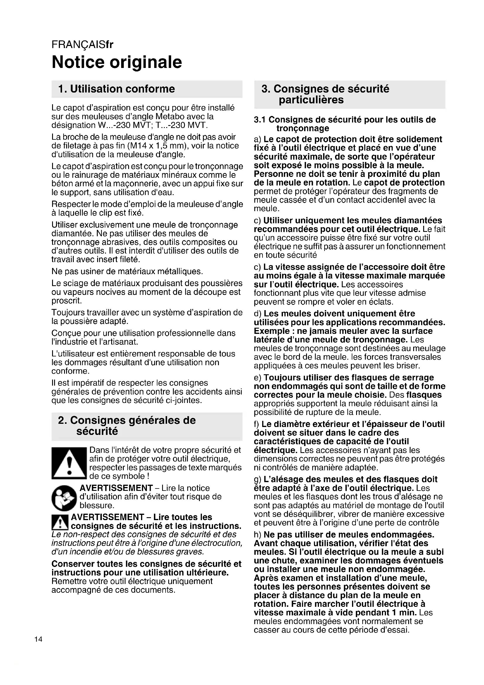Notice originale Le capot d’aspiration est conçu pour être installé sur des meuleuses d’angle Metabo avec la désignation W...-230 MVT; T...-230 MVT. La broche de la meuleuse d'angle ne doit pas avoir de filetage à pas fin (M14 x 1,5 mm), voir la notice d'utilisation de la meuleuse d'angle. Le capot d’aspiration est conçu pour le tronçonnage ou le rainurage de matériaux minéraux comme le béton armé et la maçonnerie, avec un appui fixe sur le support, sans utilisation d'eau. Respecter le mode d’emploi de la meuleuse d’angle à laquelle le clip est fixé. Utiliser exclusivement une meule de tronçonnage diamantée. Ne pas utiliser des meules de tronçonnage abrasives, des outils composites ou d’autres outils. Il est interdit d'utiliser des outils de travail avec insert fileté. Ne pas usiner de matériaux métalliques. Le sciage de matériaux produisant des poussières ou vapeurs nocives au moment de la découpe est proscrit. Toujours travailler avec un système d’aspiration de la poussière adapté. Conçue pour une utilisation professionnelle dans l'industrie et l'artisanat. L'utilisateur est entièrement responsable de tous les dommages résultant d'une utilisation non conforme. Il est impératif de respecter les consignes générales de prévention contre les accidents ainsi que les consignes de sécurité ci-jointes. Dans l'intérêt de votre propre sécurité et afin de protéger votre outil électrique, respecter les passages de texte marqués de ce symbole ! AVERTISSEMENT – Lire la notice d’utilisation afin d’éviter tout risque de blessure. AVERTISSEMENT – Lire toutes les consignes de sécurité et les instructions. Le non-respect des consignes de sécurité et des instructions peut être à l'origine d'une électrocution, d'un incendie et/ou de blessures graves. Conserver toutes les consignes de sécurité et instructions pour une utilisation ultérieure. Remettre votre outil électrique uniquement accompagné de ces documents.