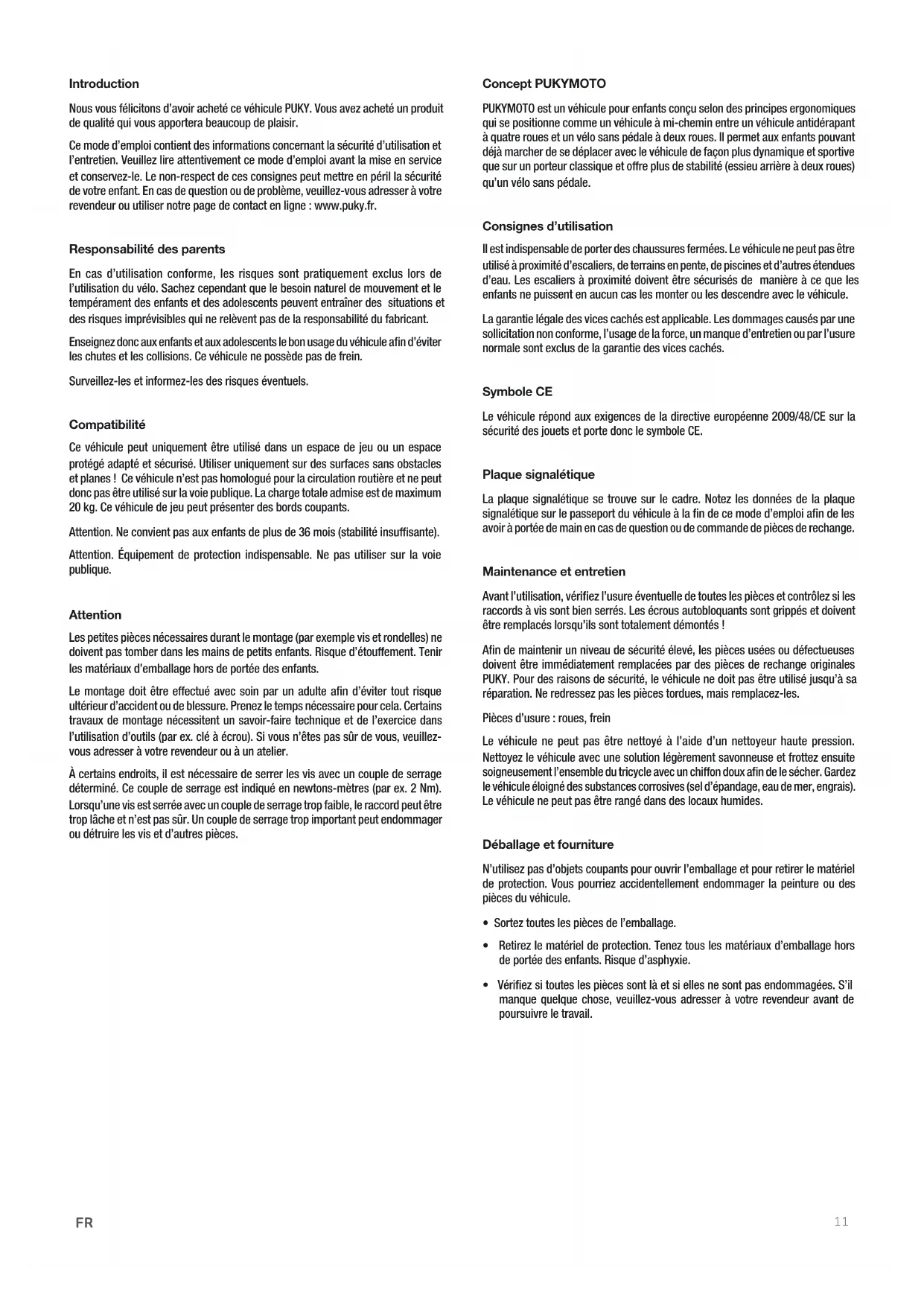 Introduction Nous vous félicitons d’avoir acheté ce véhicule PUKY. Vous avez acheté un produit de qualité qui vous apportera beaucoup de plaisir. Ce mode d’emploi contient des informations concernant la sécurité d’utilisation et l’entretien. Veuillez lire attentivement ce mode d’emploi avant la mise en service et conservez-le. Le non-respect de ces consignes peut mettre en péril la sécurité de votre enfant. En cas de question ou de problème, veuillez-vous adresser à votre revendeur ou utiliser notre page de contact en ligne : www.puky.fr. Responsabilité des parents En cas d’utilisation conforme, les risques sont pratiquement exclus lors de l’utilisation du vélo. Sachez cependant que le besoin naturel de mouvement et le tempérament des enfants et des adolescents peuvent entraîner des situations et des risques imprévisibles qui ne relèvent pas de la responsabilité du fabricant. Enseignez donc aux enfants et aux adolescents le bon usage du véhicule afin d’éviter les chutes et les collisions. Ce véhicule ne possède pas de frein. Surveillez-les et informez-les des risques éventuels. Compatibilité Ce véhicule peut uniquement être utilisé dans un espace de jeu ou un espace protégé adapté et sécurisé. Utiliser uniquement sur des surfaces sans obstacles et planes ! Ce véhicule n’est pas homologué pour la circulation routière et ne peut donc pas être utilisé sur la voie publique. La charge totale admise est de maximum 20 kg. Ce véhicule de jeu peut présenter des bords coupants. Attention. Ne convient pas aux enfants de plus de 36 mois (stabilité insusante). Attention. Équipement de protection indispensable. Ne pas utiliser sur la voie publique. Attention Les petites pièces nécessaires durant le montage (par exemple vis et rondelles) ne doivent pas tomber dans les mains de petits enfants. Risque d’étouement. Tenir les matériaux d’emballage hors de portée des enfants. Le montage doit être eectué avec soin par un adulte afin d’éviter tout risque ultérieur d’accident ou de blessure. Prenez le temps nécessaire pour cela. Certains travaux de montage nécessitent un savoir-faire technique et de l’exercice dans l’utilisation d’outils (par ex. clé à écrou). Si vous n’êtes pas sûr de vous, veuillez- vous adresser à votre revendeur ou à un atelier. À certains endroits, il est nécessaire de serrer les vis avec un couple de serrage déterminé. Ce couple de serrage est indiqué en newtons-mètres (par ex. 2 Nm). Lorsqu’une vis est serrée avec un couple de serrage trop faible, le raccord peut être trop lâche et n’est pas sûr. Un couple de serrage trop important peut endommager ou détruire les vis et d’autres pièces. Concept PUKYMOTO PUKYMOTO est un véhicule pour enfants conçu selon des principes ergonomiques qui se positionne comme un véhicule à mi-chemin entre un véhicule antidérapant à quatre roues et un vélo sans pédale à deux roues. Il permet aux enfants pouvant déjà marcher de se déplacer avec le véhicule de façon plus dynamique et sportive que sur un porteur classique et ore plus de stabilité (essieu arrière à deux roues) qu’un vélo sans pédale. Consignes d’utilisation Il est indispensable de porter des chaussures fermées. Le véhicule ne peut pas être utilisé à proximité d’escaliers, de terrains en pente, de piscines et d’autres étendues d’eau. Les escaliers à proximité doivent être sécurisés de manière à ce que les enfants ne puissent en aucun cas les monter ou les descendre avec le véhicule. La garantie légale des vices cachés est applicable. Les dommages causés par une sollicitation non conforme, l’usage de la force, un manque d’entretien ou par l’usure normale sont exclus de la garantie des vices cachés. Symbole CE Le véhicule répond aux exigences de la directive européenne 2009/48/CE sur la sécurité des jouets et porte donc le symbole CE. Plaque signalétique La plaque signalétique se trouve sur le cadre. Notez les données de la plaque signalétique sur le passeport du véhicule à la fin de ce mode d’emploi afin de les avoir à portée de main en cas de question ou de commande de pièces de rechange. Maintenance et entretien Avant l’utilisation, vérifiez l’usure éventuelle de toutes les pièces et contrôlez si les raccords à vis sont bien serrés. Les écrous autobloquants sont grippés et doivent être remplacés lorsqu’ils sont totalement démontés ! Afin de maintenir un niveau de sécurité élevé, les pièces usées ou défectueuses doivent être immédiatement remplacées par des pièces de rechange originales PUKY. Pour des raisons de sécurité, le véhicule ne doit pas être utilisé jusqu’à sa réparation. Ne redressez pas les pièces tordues, mais remplacez-les. Pièces d’usure : roues, frein Le véhicule ne peut pas être nettoyé à l’aide d’un nettoyeur haute pression. Nettoyez le véhicule avec une solution légèrement savonneuse et frottez ensuite soigneusement l’ensemble du tricycle avec un chion doux afin de le sécher. Gardez le véhicule éloigné des substances corrosives (sel d’épandage, eau de mer, engrais). Le véhicule ne peut pas être rangé dans des locaux humides. Déballage et fourniture N’utilisez pas d’objets coupants pour ouvrir l’emballage et pour retirer le matériel de protection. Vous pourriez accidentellement endommager la peinture ou des pièces du véhicule.