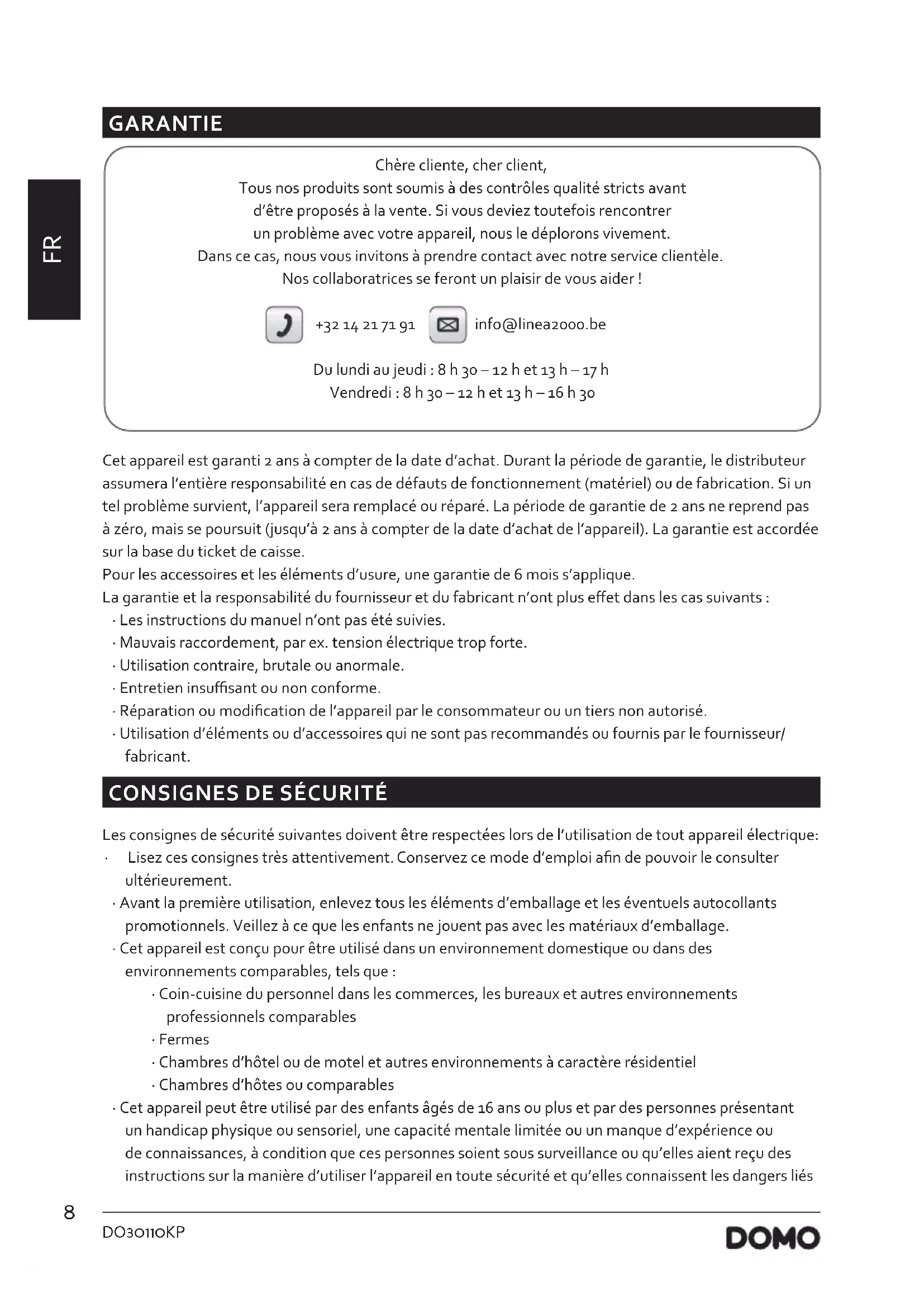 - Débranchez immédiatement l’appareil si une ssure ou une fêlure apparaît et assurez-vous de le faire réviser par un électricien compétent. L’appareil peut chauer pendant l’utilisation. Tenez le cordon électrique à distance de parties chaudes et ne couvrez pas l’appareil. CONSERVEZ CES CONSIGNES POUR POUVOIR LES CONSULTER ULTÉRIEUREMENT11 DO30110KP www.domo-elektro.be