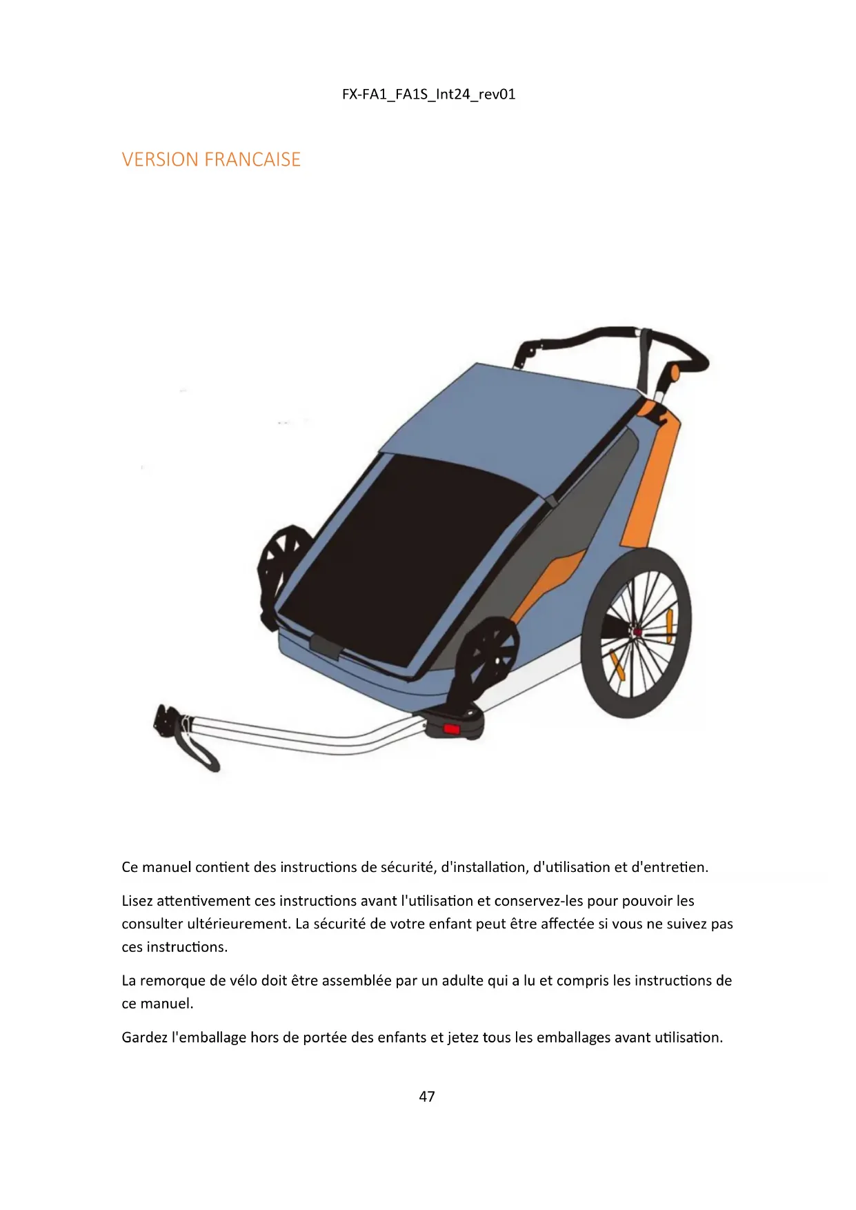 Ce manuel conent des instrucons de sécurité, d'installaon, d'ulisaon et d'entreen. Lisez aenvement ces instrucons avant l'ulisaon et conservez-les pour pouvoir les consulter ultérieurement. La sécurité de votre enfant peut être aectée si vous ne suivez pas ces instrucons. La remorque de vélo doit être assemblée par un adulte qui a lu et compris les instrucons de ce manuel. Gardez l'emballage hors de portée des enfants et jetez tous les emballages avant ulisaon.FX-FA1_FA1S_Int24_rev01