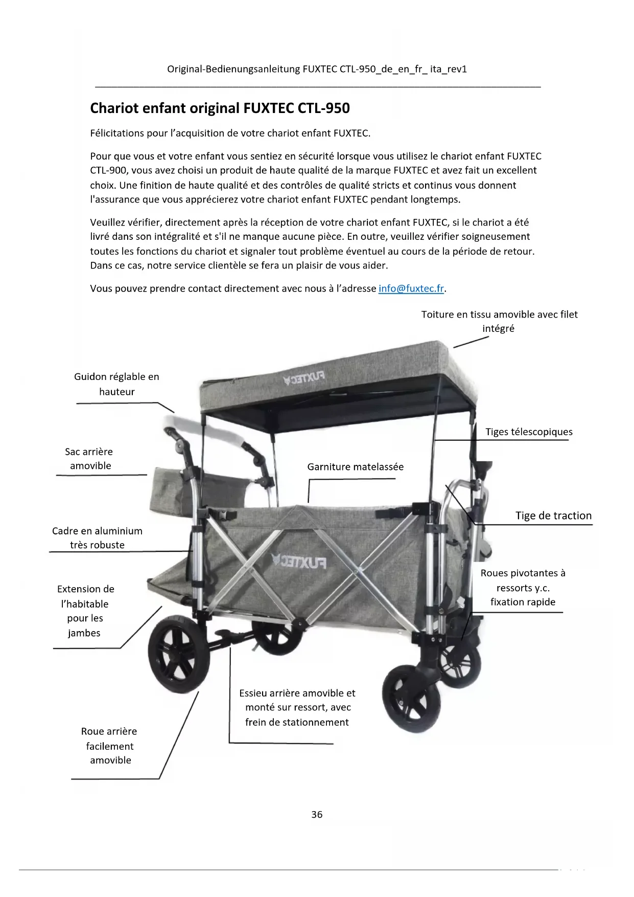Chariot enfant original FUXTEC CTL-950 Félicitations pour l’acquisition de votre chariot enfant FUXTEC. Pour que vous et votre enfant vous sentiez en sécurité lorsque vous utilisez le chariot enfant FUXTEC CTL-900, vous avez choisi un produit de haute qualité de la marque FUXTEC et avez fait un excellent choix. Une finition de haute qualité et des contrôles de qualité stricts et continus vous donnent l'assurance que vous apprécierez votre chariot enfant FUXTEC pendant longtemps. Veuillez vérifier, directement après la réception de votre chariot enfant FUXTEC, si le chariot a été livré dans son intégralité et s'il ne manque aucune pièce. En outre, veuillez vérifier soigneusement toutes les fonctions du chariot et signaler tout problème éventuel au cours de la période de retour. Dans ce cas, notre service clientèle se fera un plaisir de vous aider. Vous pouvez prendre contact directement avec nous à l’adresse info@fuxtec.fr.