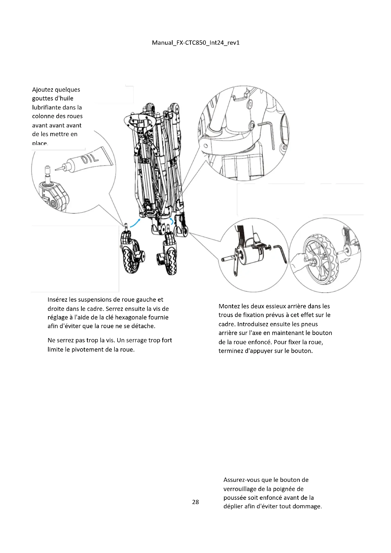 Ajoutez quelques gouttes d'huile lubrifiante dans la colonne des roues avant avant avant de les mettre en place. Montez les deux essieux arrière dans les trous de fixation prévus à cet effet sur le cadre. Introduisez ensuite les pneus arrière sur l'axe en maintenant le bouton de la roue enfoncé. Pour fixer la roue, terminez d'appuyer sur le bouton. Insérez les suspensions de roue gauche et droite dans le cadre. Serrez ensuite la vis de réglage à l'aide de la clé hexagonale fournie afin d'éviter que la roue ne se détache. Ne serrez pas trop la vis. Un serrage trop fort limite le pivotement de la roue. Assurez-vous que le bouton de verrouillage de la poignée de poussée soit enfoncé avant de la déplier afin d'éviter tout dommage.Manual_FX-CTC850_Int24_rev1
