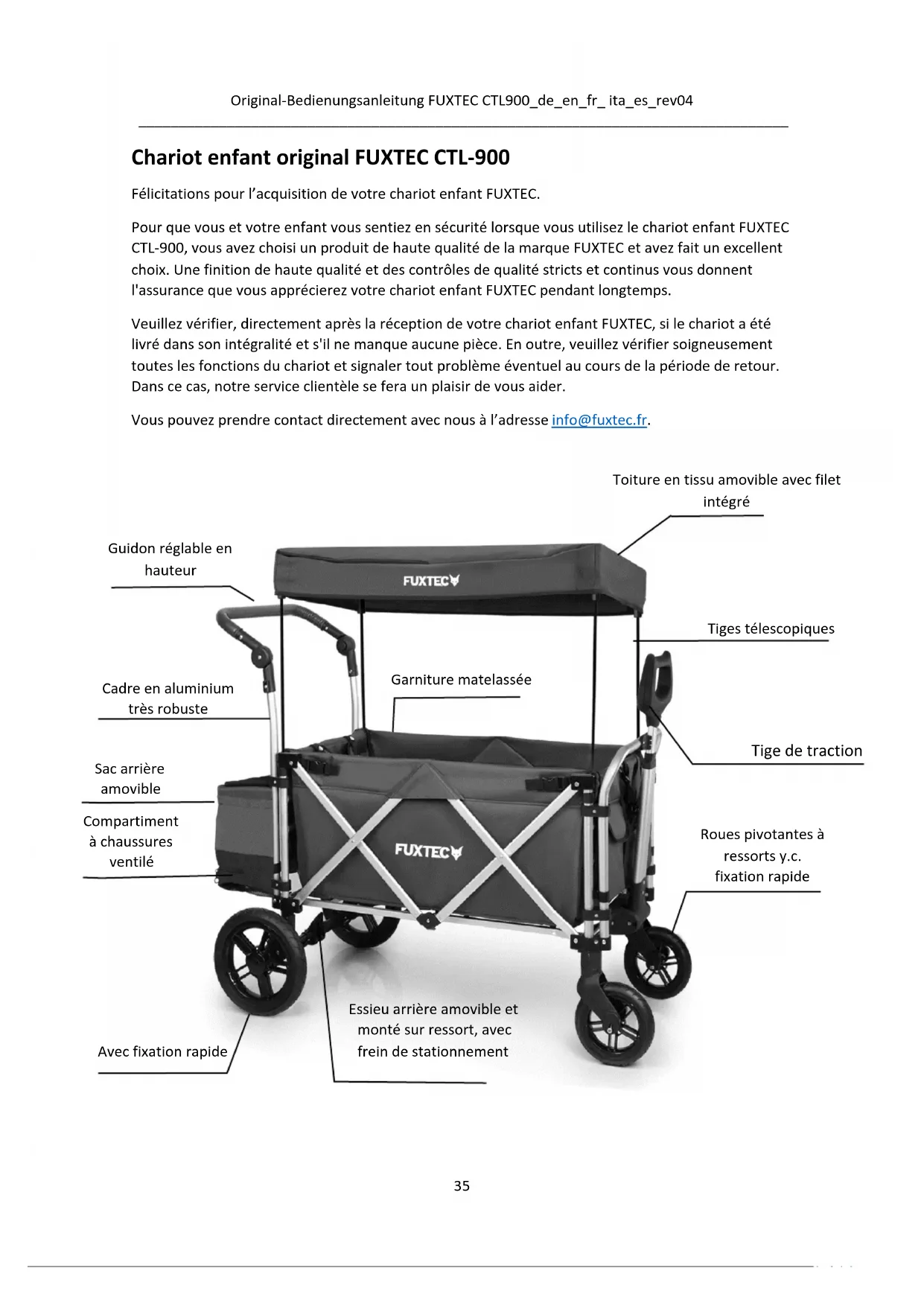 Chariot enfant original FUXTEC CTL-900 Félicitations pour l’acquisition de votre chariot enfant FUXTEC. Pour que vous et votre enfant vous sentiez en sécurité lorsque vous utilisez le chariot enfant FUXTEC CTL-900, vous avez choisi un produit de haute qualité de la marque FUXTEC et avez fait un excellent choix. Une finition de haute qualité et des contrôles de qualité stricts et continus vous donnent l'assurance que vous apprécierez votre chariot enfant FUXTEC pendant longtemps. Veuillez vérifier, directement après la réception de votre chariot enfant FUXTEC, si le chariot a été livré dans son intégralité et s'il ne manque aucune pièce. En outre, veuillez vérifier soigneusement toutes les fonctions du chariot et signaler tout problème éventuel au cours de la période de retour. Dans ce cas, notre service clientèle se fera un plaisir de vous aider. Vous pouvez prendre contact directement avec nous à l’adresse info@fuxtec.fr.