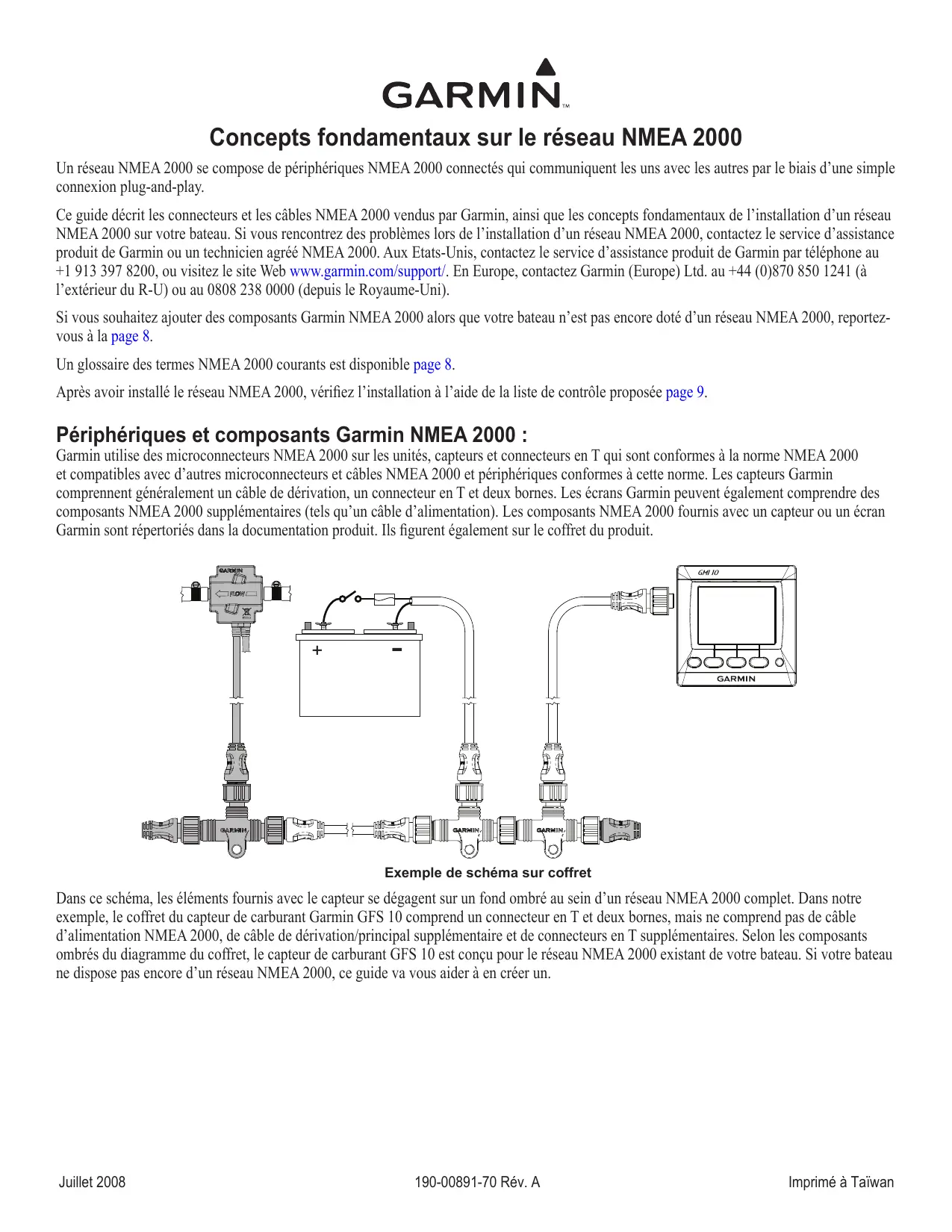 Ce guide décrit les connecteurs et les câbles NMEA 2000 vendus par Garmin, ainsi que les concepts fondamentaux de l'installation d’un réseau NMEA 2000 sur votre bateau. Si vous rencontrez des problèmes lors de l'installation d’un réseau NMEA 2000, contactez le service d'assistance produit de Garmin ou un technicien agréé NMEA 2000. Aux Etats-Unis, contactez le service d'assistance produit de Garmin par téléphone au +1913 397 8200, ou visitez le site Web www.garmin.com/support/. En Europe, contactez Garmin (Europe) Ltd. au +44 (0)870 850 1241 (à l'extérieur du R-U) ou au 0808 238 0000 (depuis le Royaume-Uni).