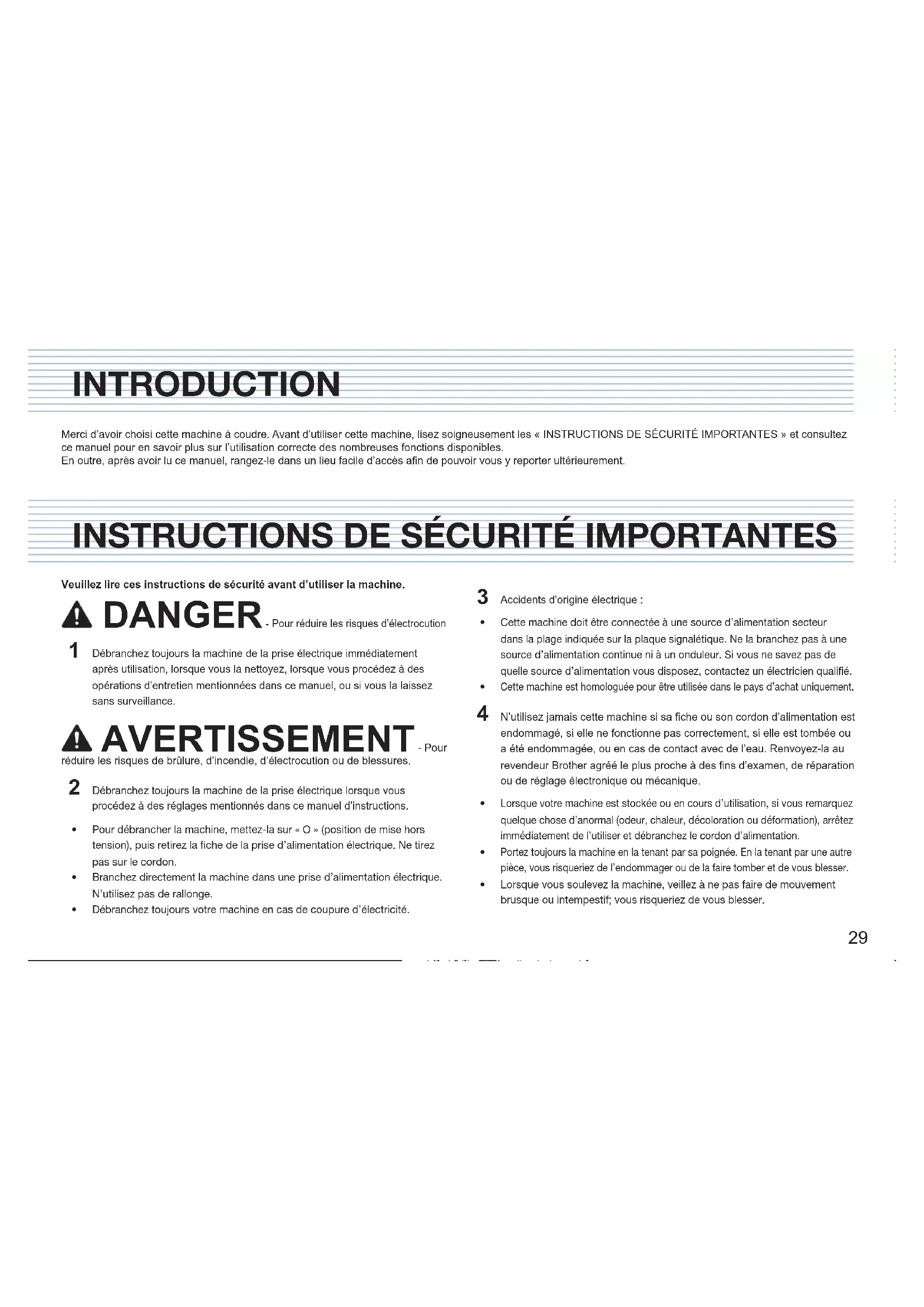 Veuillez lire ces instructions de sécurité avant d’utiliser la machine. DANGER - Pour réduire les risques d’électrocution