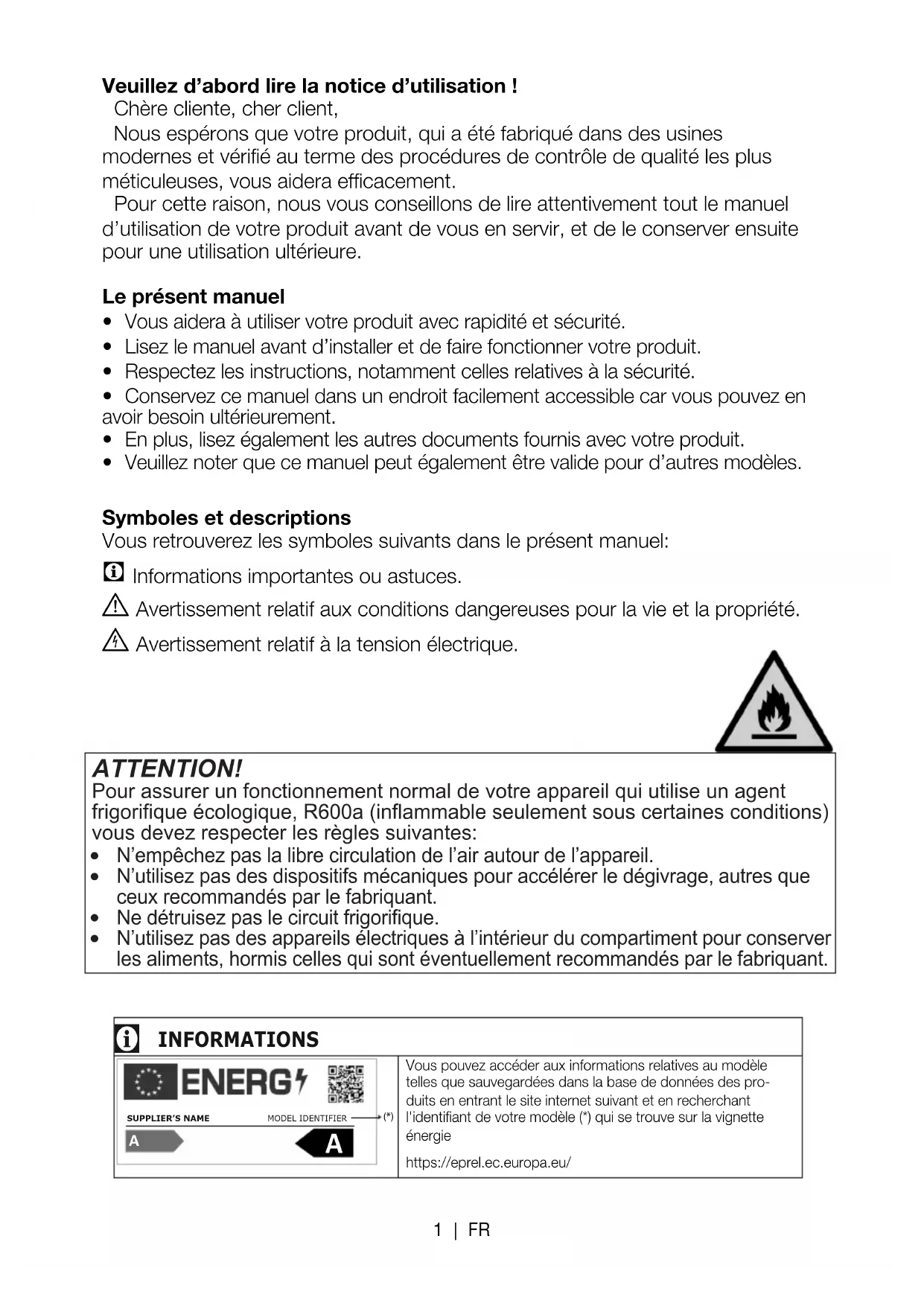 1 | FR1 Votre réfrigérateur 3 2 Précautions de sécurité importantes