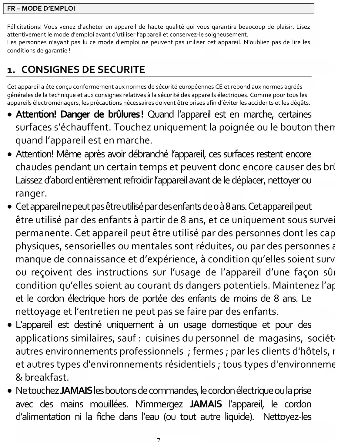 - Attention! Danger de brûlures ! Quand l’appareil est en marche, certaines surfaces s’échauffent. Touchez uniquement la poignée ou le bouton thermostat quand l’appareil est en marche.