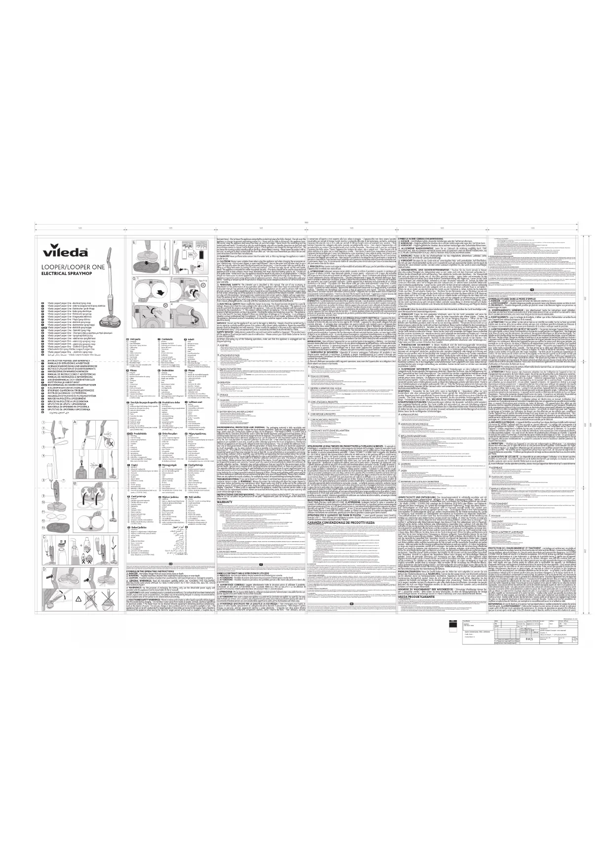 1. FHP Vileda SAS garantit que le produit est exempt de défauts de matériaux et de fabrication pendant une période de deux ans à compter de la date d‘achat. 2. Si le produit présente un défaut dont FHP Vileda SAS est responsable pour quelque raison que ce soit dans les deux ans suivant la date d‘achat (“la période de garantie“), FHP Vileda SAS ou un membre du réseau de service agréé dans la zone de garantie (c‘est-à-dire n‘importe où en France) le réparera ou le remplacera sous réserve des conditions et limitations ci-dessous. FHP Vileda SAS peut remplacer les produits ou pièces défectueux par des produits ou pièces neufs ou remis à neuf. Tous les produits et pièces remplacés deviennent la propriété de FHP Vileda SAS. 3. La garantie ne couvre pas : a) l‘entretien ou la réparation périodique ou le remplacement de pièces en raison de l‘usure ; b) les consommables (c‘est-à-dire les composants dont on s‘attend à ce qu‘ils nécessitent un remplacement périodique nécessaire pendant la durée de vie d‘un produit, comme les housses ou les batteries) ; c) les dommages ou défauts causés par une utilisation, un fonctionnement ou un traitement du produit incompatible avec un usage personnel ou domestique normal ; d) les dommages ou la détérioration de l‘état ou des performances du produit résultant de : I. Une mauvaise utilisation, notamment : - un traitement entraînant des dommages physiques, esthétiques ou de surface au produit ou une détérioration de celui-ci ; - le fait de ne pas installer ou utiliser le produit pour son usage normal ou conformément aux instructions de FHP Vileda SAS pour l‘installation et l‘utilisation; - le défaut d‘entretien du produit conformément aux instructions d‘entretien de FHP Vileda SAS ; - l‘installation ou l‘utilisation du produit d‘une manière incompatible avec les lois ou normes techniques ou de sécurité du pays où il est installé. II. L‘utilisation du produit avec des accessoires, des équipements périphériques et d‘autres produits d‘un type, d‘une condition et d‘une norme autres que ceux prescrits par FHP Vileda SAS ; III. La réparation ou la tentative de réparation par des personnes qui ne sont pas des membres du réseau du service après-vente de FHP Vileda SAS ou des membres autorisés ; IV. Les accidents, le feu, les liquides, les produits chimiques, les autres substances, les inondations, les vibrations, la chaleur excessive, la ventilation inadéquate, les surtensions, la tension d‘alimentation ou d‘entrée excessive ou incorrecte, les radiations, les décharges électrostatiques, y compris l‘éclairage, les autres forces et impacts extérieurs ; ou V. tout événement ou circonstance échappant au contrôle raisonnable de FHP Vileda SAS.B. TERME 1. Les services de garanties ne seront fournis que si la facture ou le ticket de caisse original (indiquant la date d‘achat, le nom du modèle et le nom du revendeur) est présenté avec le produit défectueux pendant la période de garantie. La FHP Vileda SAS peut refuser le service de garantie gratuit si ces documents ne sont pas présentés ou s‘ils sont incomplets ou illisibles. La présente garantie ne s‘applique pas si le nom du modèle ou le numéro de série fi gurant sur le produit a été modifi é, supprimé, enlevé ou rendu illisible. 2. Sauf si FHP Vileda SAS est légalement tenu de les rembourser, la présente garantie ne couvre pas les frais de transport ni les risques liés au transport du produit vers et depuisFHP Vileda SAS. 3. Si FHP Vileda SAS ou l‘un des membres de son réseau de service agréé effectue un test de diagnostic sur le produit et que ce test démontre que le produit fonctionne correctement et qu‘aucun défaut matériel n‘est présent, vous n‘aurez pas droit à une réparation au titre de la présente garantie. Dans ce cas, vous serez tenu de payer les réparations destinées à corriger le défaut et le coût du test de diagnostic.C. EXCLUSIONS ET LIMITATIONS 1. À L‘EXCEPTION DE CE QUI EST INDIQUÉ CI-DESSUS, FHP VILEDA SAS NE DONNE AUCUNE GARANTIE (EXPRESSE, IMPLICITE, STATUTAIRE OU AUTRE) CONCERNANT LA QUALITÉ, LES PERFORMANCES, LA PRÉCISION, LA FIABILITÉ, L‘ADÉQUATION À UN USAGE PARTICULIER OU AUTRE DU PRODUIT. 2. FHP Vileda SAS n‘assume aucune responsabilité pour tout dommage causé par une utilisation incorrecte du produit. À l‘exception de ce qui est stipulé ailleurs dans la présente garantie, la responsabilité de FHP Vileda SAS ne dépassera pas le prix d‘achat du produit. Si vous avez des doutes sur l‘utilisation correcte du produit ou sur la présente garantie, veuillez appeler le service clientèle de Vileda. 3. Rien dans cette garantie n‘a pour but de restreindre ou de limiter la responsabilité de FHP Vileda SAS d‘une manière qui serait illégale, y compris en cas de décès ou de blessures corporelles causés par la négligence de FHP Vileda SAS, ou de dommages à la propriété privée causés par des biens qui s‘avèrent défectueux alors qu‘ils sont utilisés par le consommateur à la suite d‘une négligence de FHP Vileda SAS ou pour des produits défectueux en vertu de toute loi, acte ou réglementation obligatoire sur la responsabilité stricte. D. VOS DROITS LÉGAUX RÉSERVÉS Cette garantie s‘ajoute à, et n‘affecte pas, vos droits légaux obligatoires relatifs aux marchandises défectueuses ou non conformes à la description. Tous les produits seront fournis conformément au contrat. Des conseils supplémentaires concernant vos droits légaux peuvent être obtenus auprès des associations de consommateurs de votre région. Vous pouvez faire valoir tous vos droits à votre seule discrétion.E. CONTACT La garantie pour ce produit est fournie et sera honorée par FHP Vileda SAS, Tour d‘Asnières - Hall D, 4 avenue Laurent Cély, 92600 Asnières-sur-Seine, France. www.vileda.fr B/NL : FHP Vileda SComm., 