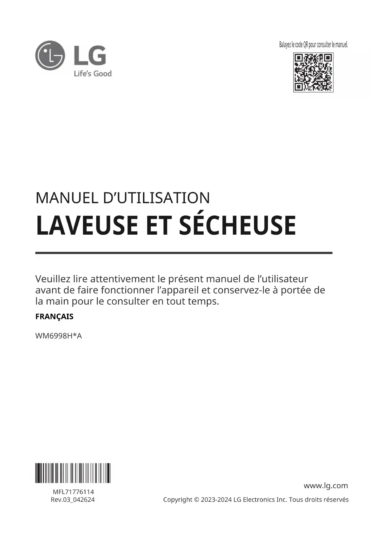 Veuillez lire attentivement le présent manuel de lʼutilisateur avant de faire fonctionner lʼappareil et conservez-le à portée de la main pour le consulter en tout temps. FRANÇAIS WM6998H*A MFL71776114Rev.03_042624 www.lg.com Copyright © 2023-2024 LG Electronics Inc. Tous droits réservés Balayez le code QR pour consulter le manuel.TABLE DES MATIÈRES