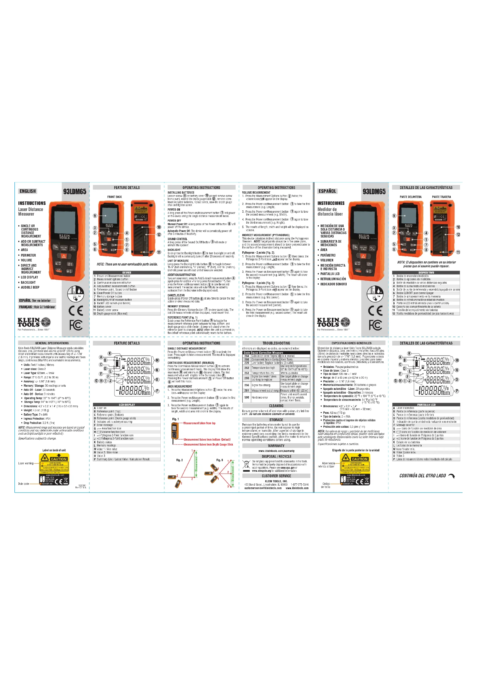 pour prendre la première mesure (p.ex. la longueur).3. Appuyer de nouveau sur le bouton de mise sous tension/mesure pour prendre la deuxième mesure (p.ex. la largeur). Les résultats de la longueur, de la largeur et de l’aire apparaîtront sur l’écran. DÉPANNAGE Tous les messages d’erreur sont affichés sous forme de codes, comme il est expliqué ci-dessous:Code Cause Solution Erreur de calculRefaire les étapes manuellement Défectuosité d’un composant Contacter KleinTools Pile faible Remplacer les piles (2xAAA) Température trop élevéeUtiliser seulement dans des températures de 0à 40°C (32à 104°F) Température trop basse Réchauffer l’appareil Signal trop faible/délai d’enregistrement trop longUtiliser le voyant ou modifier l’angle de mesure Signal trop fortUtiliser le voyant ou modifier l’angle de mesure Mesure hors de la plageMesure inférieure à 20m (65pi) Erreur physiqueAllumer et éteindre l’appareil plusieurs fois. Si l’erreur persiste, contacter KleinTools.Fig.1Mesure à partir du hautMesure à partir du bas par défaut Mesure à partir de la jauge de profondeur amovible