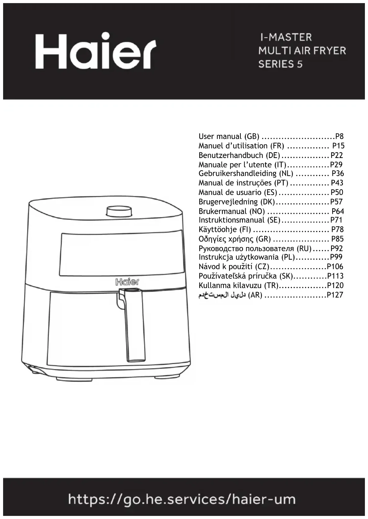 EU 2023/826 Power Consumption Off Mode N.A. Power Consumption StandBy Mode 0.3W Power Consumption StandBy Mode with info display N.A. Power Consumption Networked StandBy N.A. Time to reach Off Mode/ StandBy/StandBy with display/ Networked StandBy 7min15 Cet appareil est réservé à un usage domestique et à l’intérieur, tel que décrit dans ce guide d’utilisation. Veuillez vous assurer que ces instructions sont bien prises en compte avant d’utiliser l’appareil. MISE EN GARDE : Pour éviter tout risque d’étouffement chez les enfants, jetez tous les matériaux d’emballage immédiatement après avoir désemballé le produit. Du papier d’emballage pourrait être présent à l’intérieur de l’appareil selon les modèles que vous avez achetés, jetez tout emballage avant d’utiliser l’appareil an d’éviter un incendie. Cet appareil peut être utilisé par des enfants âgés d’au moins 8 ans et par des personnes ayant des capacités physiques, sensorielles ou mentales réduites, ou n’ayant pas d’expérience ou de connaissances en la matière. Ces derniers doivent recevoir des instructions sur l’utilisation sécurisée de l’appareil et comprendre les risques impliqués. Les enfants sont interdis de jouer avec l’appareil. Le nettoyage et l’entretien de l’appareil ne doivent pas être effectués par des enfants, sauf s’ils ont plus de 8 ans et sont supervisés. Tenez l’appareil et son câble hors de la portée des enfants de moins de 8 ans. Si le câble d’alimentation est endommagé, arrêtez immédiatement d’utiliser l’appareil. Pour éviter tout risque de sécurité, un réparateur Haier agréé doit remplacer le câble d’alimentation. N’utilisez que les accessoires, les consommables et les pièces de rechange recommandés ou fournis par Haier. L’utilisation d’accessoires et dispositifs non recommandés par Haier pourrait causer des blessures. N’utilisez l’appareil qu’en fonction de la puissance indiquée sur la che signalétique. MISE EN GARDE : Risque de brûlure ! Ne jamais toucher l’intérieur de l’appareil durant et après l’utilisation. L’élément chauffant est soumis à une chaleur résiduelle après utilisation. Veuillez toujours utiliser la poignée pour porter le panier. Pressez le bouton de relâchement du panier uniquement avec le panier reposant à plat sur un comptoir (ou toute autre surface résistante à la chaleur). Ne bloquez aucune ouverture pour la ventilation. La vapeur chaude est libérée à travers les sorties d’air. Gardez les mains à l’écart de la vapeur chaude et des ouvertures. Faites aussi attention à la vapeur et à l’air chaud lorsque vous retirez le panier de l’appareil. Ne faites pas fonctionner l’appareil à l’aide d’une minuterie externe ou d’un