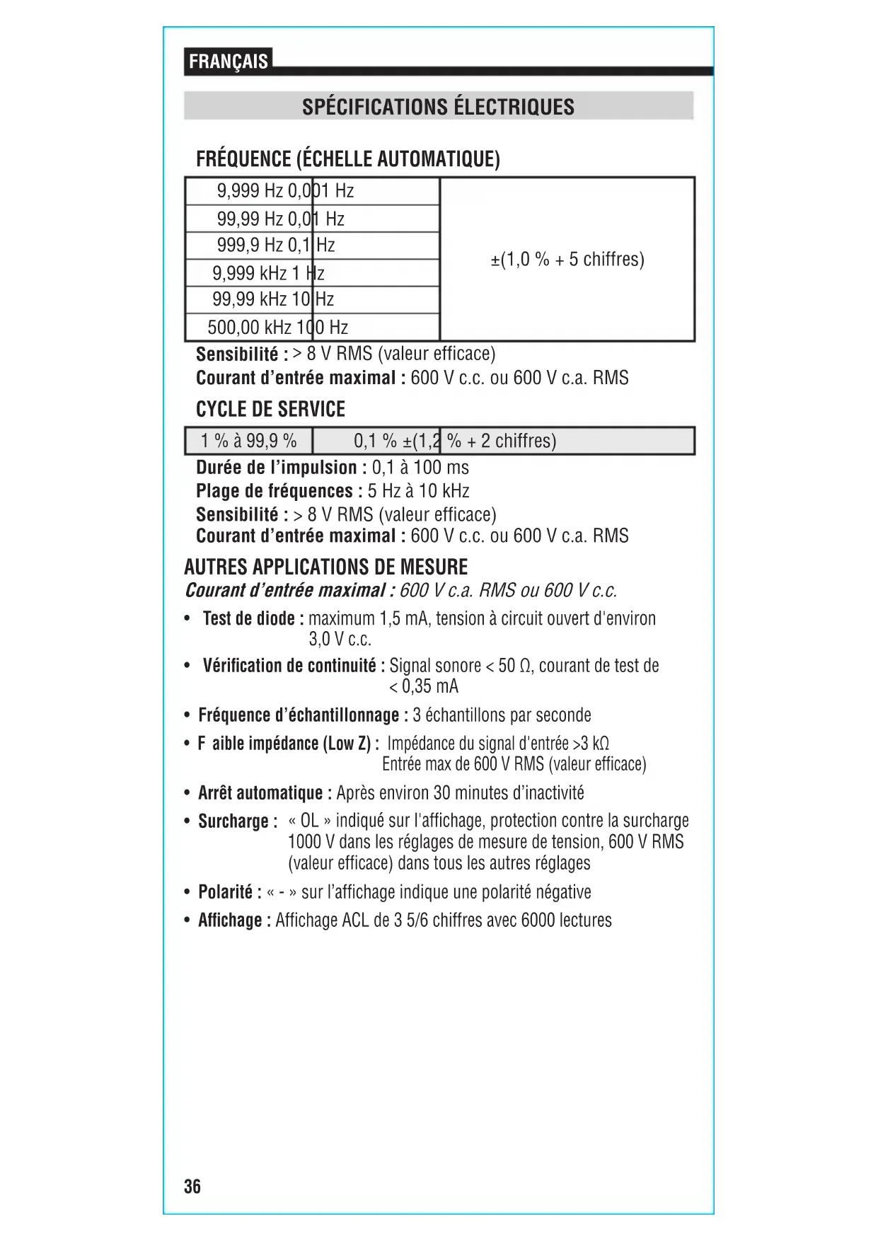 1% à 99,9% 0,1% ±(1,2% + 2chiffres) Durée de l’impulsion: 0,1 à 100ms Plage de fréquences: 5Hz à 10kHz Sensibilité: >8V RMS (valeur efficace) Courant d’entrée maximal: 600V c.c. ou 600V c.a. RMS