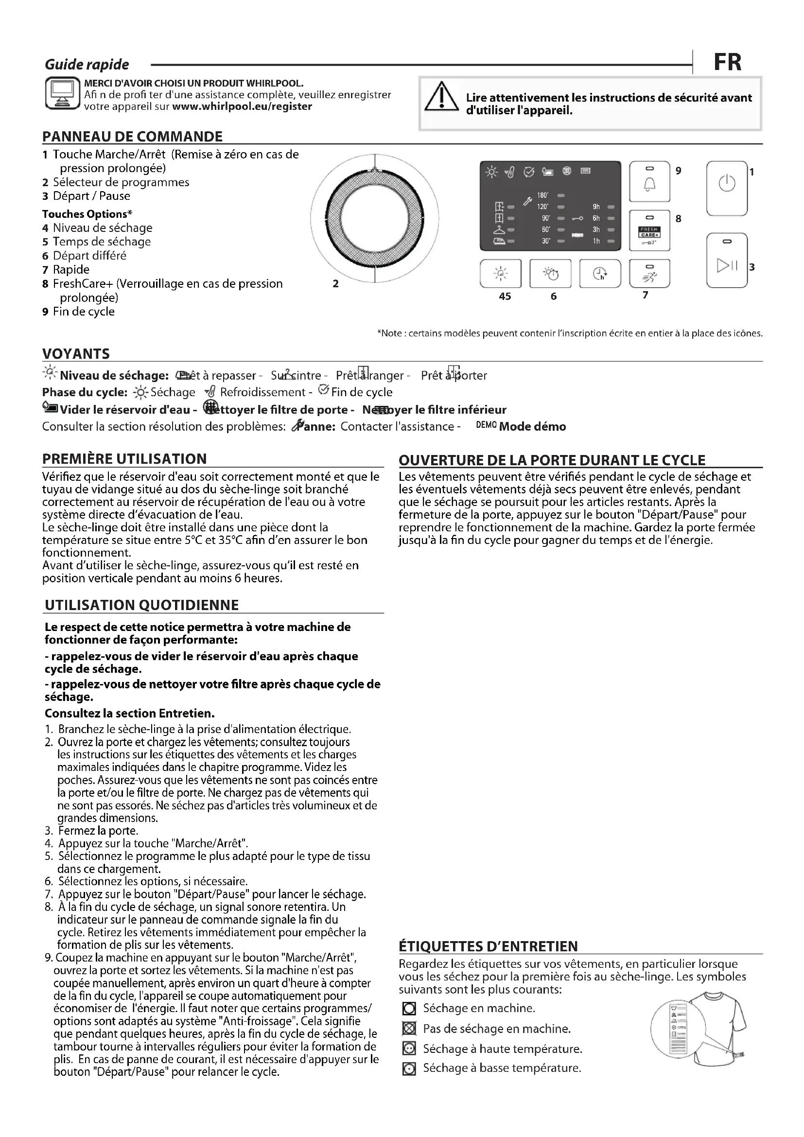 1 Touche Marche/Arrêt (Remise à zéro en cas de pression prolongée) 2 Sélecteur de programmes 3 Départ / Pause Touches Options* 4 Niveau de séchage 5 Temps de séchage 6 Départ différé 7 Rapide 8 FreshCare+ (Verrouillage en cas de pression prolongée) 9 Fin de cycle *Note : certains modèles peuvent contenir l’inscription écrite en entier à la place des icônes. VOYANTS Niveau de séchage: Prêt à repasser - Sur cintre - Prêt à ranger - Prêt à porter Phase du cycle: Séchage Refroidissement - Fin de cycle Vider le réservoir d'eau - Nettoyer le ltre de porte - Nettoyer le ltre inférieur Consulter la section résolution des problèmes: Panne: Contacter l'assistance - DEMO Mode démo