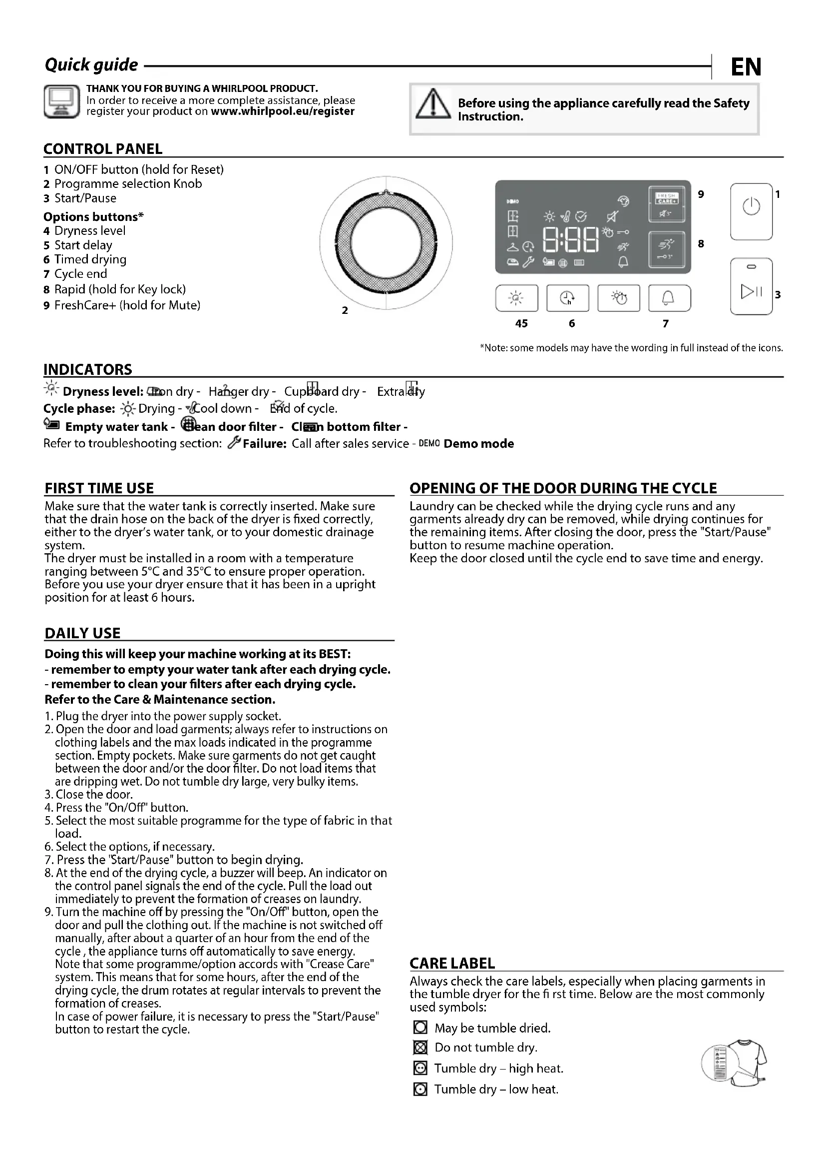 1 Touche Marche/Arrêt (Remise à zéro en cas de pression prolongée) 2 Sélecteur de programmes 3 Départ / Pause Touches Options* 4 Niveau de séchage 5 Départ diéré 6 Temps de séchage 7 Fin de cycle 8 Rapide (Verrouillage en cas de pression prolongée) 9 FreshCare+ (Silence en cas de pression prolongée) *Note : certains modèles peuvent contenir l’inscription écrite en entier à la place des icônes. VOYANTS Niveau de séchage: Prêt à repasser - Sur cintre - Prêt à ranger - Prêt à porter Phase du cycle: Séchage - Refroidissement - Fin de cycle Vider le réservoir d’eau - Nettoyer le ltre de porte - Nettoyer le ltre inférieur Consulter la section résolution des problèmes: Panne: Contacter l'assistance - DEMO Mode démo