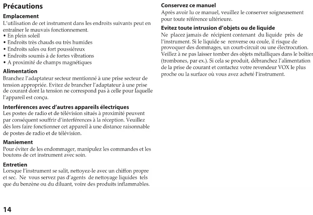 - A proximité de champs magnétiques Alimentation Branchez l’adaptateur secteur mentionné à une prise secteur de tension appropriée. Evitez de brancher l’adaptateur à une prise de courant dont la tension ne correspond pas à celle pour laquelle l’appareil est conçu. Interférences avec d’autres appareils électriques Les postes de radio et de télévision situés à proximité peuvent par conséquent sourir d’interférences à la réception. Veuillez dès lors faire fonctionner cet appareil à une distance raisonnable de postes de radio et de télévision. Maniement Pour éviter de les endommager, manipulez les commandes et les boutons de cet instrument avec soin. Entretien Lorsque l’instrument se salit, neoyez-le avec un chion propre et sec. Ne vous servez pas d’agents de neoyage liquides tels que du benzène ou du diluant, voire des produits inammables. Conservez ce manuel Après avoir lu ce manuel, veuillez le conserver soigneusement pour toute référence ultérieure. Evitez toute intrusion d’objets ou de liquide Ne placez jamais de récipient contenant du liquide près de l’instrument. Si le liquide se renverse ou coule, il risque de provoquer des dommages, un court-circuit ou une électrocution. Veillez à ne pas laisser tomber des objets métalliques dans le boîtier (trombones, par ex.). Si cela se produit, débranchez l’alimentation de la prise de courant et contactez votre revendeur VOX le plus proche ou la surface où vous avez acheté l’instrument.15 Note concernant les dispositions (Seulement EU) Quand un symbole avec une poubelle barrée d’une croix apparait sur le produit, le mode d’emploi, les piles ou le pack de piles, cela signie que ce produit, manuel ou piles doit être déposé chez un représentant compétent, et non pas dans une poubelle ou toute autre décheerie conventionnelle. Disposer de cee manière, de prévenir les dommages pour la santé humaine et les dommages potentiels pour l’environnement. La bonne méthode d’élimination dépendra des lois et règlements applicables dans votre localité, s’il vous plaît, contactez votre organisme administratif pour plus de détails. Si la pile contient des métaux lourds au-delà du seuil réglementé, un symbole chimique est aché en dessous du symbole de la poubelle barrée d’une croix sur la pile ou le pack de piles.