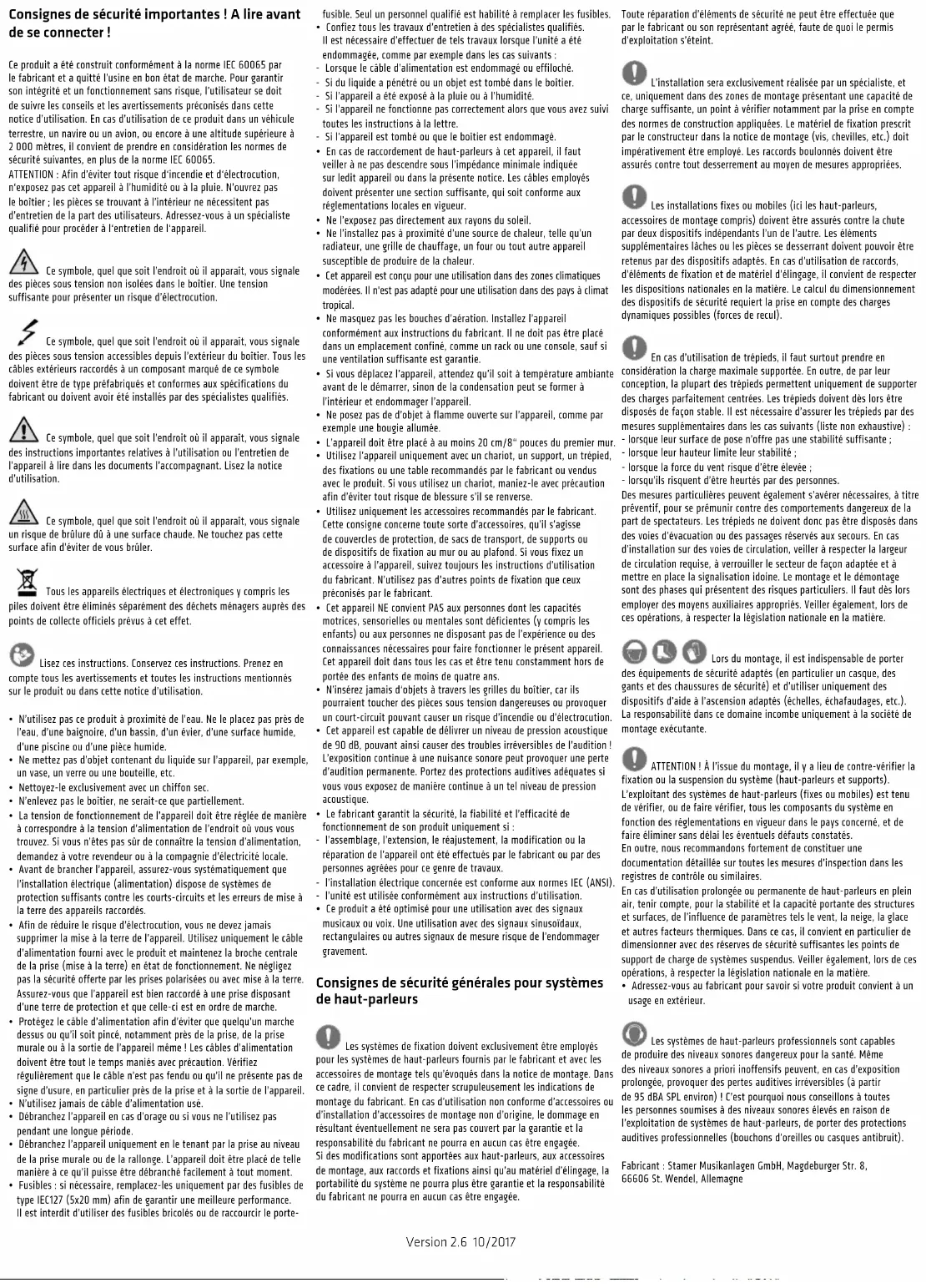 - Ce produit a été optimisé pour une utilisation avec des signaux musicaux ou voix. Une utilisation avec des signaux sinusoïdaux, rectangulaires ou autres signaux de mesure risque de l’endommager gravement. Consignes de sécurité générales pour systèmes de haut-parleurs Les systèmes de fixation doivent exclusivement être employés pour les systèmes de haut-parleurs fournis par le fabricant et avec les accessoires de montage tels qu’évoqués dans la notice de montage. Dans ce cadre, il convient de respecter scrupuleusement les indications de montage du fabricant. En cas d’utilisation non conforme d’accessoires ou d’installation d’accessoires de montage non d’origine, le dommage en résultant éventuellement ne sera pas couvert par la garantie et la responsabilité du fabricant ne pourra en aucun cas être engagée. Si des modifications sont apportées aux haut-parleurs, aux accessoires de montage, aux raccords et fixations ainsi qu’au matériel d’élingage, la portabilité du système ne pourra plus être garantie et la responsabilité du fabricant ne pourra en aucun cas être engagée. Toute réparation d’éléments de sécurité ne peut être effectuée que par le fabricant ou son représentant agréé, faute de quoi le permis d’exploitation s’éteint. L’installation sera exclusivement réalisée par un spécialiste, et ce, uniquement dans des zones de montage présentant une capacité de charge suffisante, un point à vérifier notamment par la prise en compte des normes de construction appliquées. Le matériel de fixation prescrit par le constructeur dans la notice de montage (vis, chevilles, etc.) doit impérativement être employé. Les raccords boulonnés doivent être assurés contre tout desserrement au moyen de mesures appropriées. Les installations fixes ou mobiles (ici les haut-parleurs, accessoires de montage compris) doivent être assurés contre la chute par deux dispositifs indépendants l’un de l’autre. Les éléments supplémentaires lâches ou les pièces se desserrant doivent pouvoir être retenus par des dispositifs adaptés. En cas d’utilisation de raccords, d’éléments de fixation et de matériel d’élingage, il convient de respecter les dispositions nationales en la matière. Le calcul du dimensionnement des dispositifs de sécurité requiert la prise en compte des charges dynamiques possibles (forces de recul). En cas d’utilisation de trépieds, il faut surtout prendre en considération la charge maximale supportée. En outre, de par leur conception, la plupart des trépieds permettent uniquement de supporter des charges parfaitement centrées. Les trépieds doivent dès lors être disposés de façon stable. Il est nécessaire d’assurer les trépieds par des mesures supplémentaires dans les cas suivants (liste non exhaustive) : - lorsque leur surface de pose n’offre pas une stabilité suffisante; - lorsque leur hauteur limite leur stabilité ; - lorsque la force du vent risque d’être élevée ; - lorsqu’ils risquent d’être heurtés par des personnes. Des mesures particulières peuvent également s’avérer nécessaires, à titre préventif, pour se prémunir contre des comportements dangereux de la part de spectateurs. Les trépieds ne doivent donc pas être disposés dans des voies d’évacuation ou des passages réservés aux secours. En cas d’installation sur des voies de circulation, veiller à respecter la largeur de circulation requise, à verrouiller le secteur de façon adaptée et à mettre en place la signalisation idoine. Le montage et le démontage sont des phases qui présentent des risques particuliers. Il faut dès lors employer des moyens auxiliaires appropriés. Veiller également, lors de ces opérations, à respecter la législation nationale en la matière. Lors du montage, il est indispensable de porter des équipements de sécurité adaptés (en particulier un casque, des gants et des chaussures de sécurité) et d’utiliser uniquement des dispositifs d’aide à l’ascension adaptés (échelles, échafaudages, etc.). La responsabilité dans ce domaine incombe uniquement à la société de montage exécutante. ATTENTION! À l’issue du montage, il y a lieu de contre-vérifier la fixation ou la suspension du système (haut-parleurs et supports). L’exploitant des systèmes de haut-parleurs (fixes ou mobiles) est tenu de vérifier, ou de faire vérifier, tous les composants du système en fonction des réglementations en vigueur dans le pays concerné, et de faire éliminer sans délai les éventuels défauts constatés. En outre, nous recommandons fortement de constituer une documentation détaillée sur toutes les mesures d’inspection dans les registres de contrôle ou similaires. En cas d’utilisation prolongée ou permanente de haut-parleurs en plein air, tenir compte, pour la stabilité et la capacité portante des structures et surfaces, de l’influence de paramètres tels le vent, la neige, la glace et autres facteurs thermiques. Dans ce cas, il convient en particulier de dimensionner avec des réserves de sécurité suffisantes les points de support de charge de systèmes suspendus. Veiller également, lors de ces opérations, à respecter la législation nationale en la matière.
