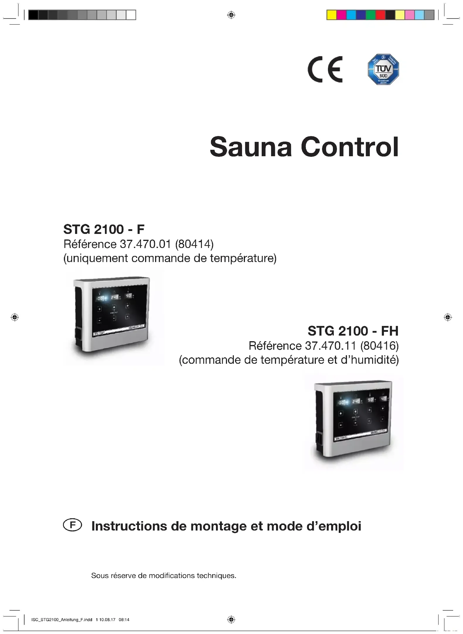 Commande de sauna Les appareils de commande STG 2100 – F et STG 2100 – FH font partie intégrante d’une cabine de sauna fonctionnant correctement dès lors que toutes les conditions requises sont remplies de façon appropriée. Un appareil de commande en combinaison avec un poêle de sauna approprié ne peut fonctionner de manière optimale que si les raccords électriques du distributeur principal à l’appareil de commande et de l’appareil de commande au poêle de sauna sont réalisés correctement et par un spécialiste conformément aux schémas de raccordement et aux prescriptions avec le matériel prévu à cet effet. Les dérangements de l’appareil de commande peuvent également résulter d’une amenée d’air insuffisante ou d’une ventilation insuffisante du poêle de sauna ainsi que d’ouvertures d’évacuation de l’air trop petites ou manquantes suite à un fonctionnement continu. Veuillez pour ce faire tenir compte de notre « Fiche d’information » jointe. En cas de réglage de température et d’humidité, il peut y avoir des différences entre la température et l’humidité réglées et affichées. Cela s’explique par le fait que la plupart des appareils d’affichage mécaniques sont montés sur la paroi intérieure du sauna. La paroi du sauna présente cependant toujours des températures inférieures à la température ambiante réelle dans la cabine. Les indicateurs d’humidité peuvent aussi afficher des valeurs incorrectes lors du redémarrage tant que la cabine n’a pas été chauffée à une température suffisante.