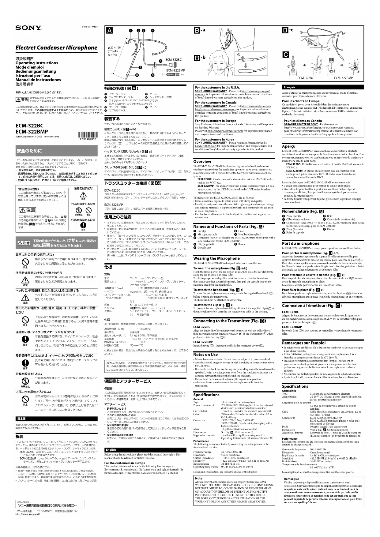 Do not bend the boom while adjusting the capsule case position. After use, be sure to disconnect the microphone cable from the transmitter. Specifications General Type Electret condenser microphone Power requirement 2 V DC to 10 V DC (supplied from the external device, such as a Sony wireless transmitter) Current drain 1.3 mA or less (with the standard load circuit) Cable 2.0 mm dia., 2-conductor shielded cable, 1.2 m (3.9 feet) long Connector ECM-322BC: Sony SMC9-4P ECM-322BMP: 3-pole mini phono plug with a lock mechanism Mass 10 g (0.4 oz) (without connector) Dimensions See Fig. . Unit: mm (inch) Supplied accessories Headband (1), clip (1), carrying case (1), Operating Instructions (1), warranty booklet (1) Performance The following items were tested by connecting the microphones to the standard load circuits. Frequency range 50 Hz to 18,000 Hz Directivity Omni-directional Output impedance 1.4 kΩ ±30%, unbalanced Sensitivity –42.0 dB SPL (7.94 mV) ±3.0 dB (1 kHz/Pa) Inherent noise 34 dB SPL or less Operating temperature 0°C to +60°C (32°F to 140°F) Design and specifications are subject to change without notice. Note Always verify that the unit is operating properly before use. SONY WILL NOT BE LIABLE FOR DAMAGES OF ANY KIND INCLUDING, BUT NOT LIMITED TO, COMPENSATION OR REIMBURSEMENT ON ACCOUNT OF THE LOSS OF PRESENT OR PROSPECTIVE PROFITS DUE TO FAILURE OF THIS UNIT, EITHER DURING THE WARRANTY PERIOD OR AFTER EXPIRATION OF THE WARRANTY, OR FOR ANY OTHER REASON WHATSOEVER. Français Avant d’utiliser ce microphone, lisez attentivement ce mode d’emploi à conserver pour toute référence ultérieure. Pour les clients en Europe Ce produit est prévu pour être utilisé dans les environnements électromagnétiques suivants : E1 (résidentiel), E2 (commercial et industrie légère), E3 (urbain extérieur) et E4 (environnement EMC contrôlé, ex. studio de télévision). Pour les clients au Canada GARANTIE LIMITÉE DE SONY - Rendez-vous sur http://www.sonybiz.ca/pro/lang/en/ca/article/resources-warranty pour obtenir les informations importantes et l’ensemble des termes et conditions de la garantie limitée de Sony applicable à ce produit. Aperçu Le ECM-322BC/322BMP est un microphone condensateur à électrets omnidirectionnel à écouteurs pour le fonctionnement mains libres lors d’un événement, séminaire etc. en combinaison avec un émetteur du système de microphone sans fil UHF Sony. ECM-322BC: Utilisable avec un émetteur à douille SMC9-4S, comme le WRT-822. ECM-322BMP: A utiliser exclusivement avec un émetteur Sony à miniprise 3 pôles, comme le UTX-B1 inclus dans l’ensemble de microphone sans fil de série UWP. Les caractéristiques du ECM-322BC/322BMP sont comme suit: