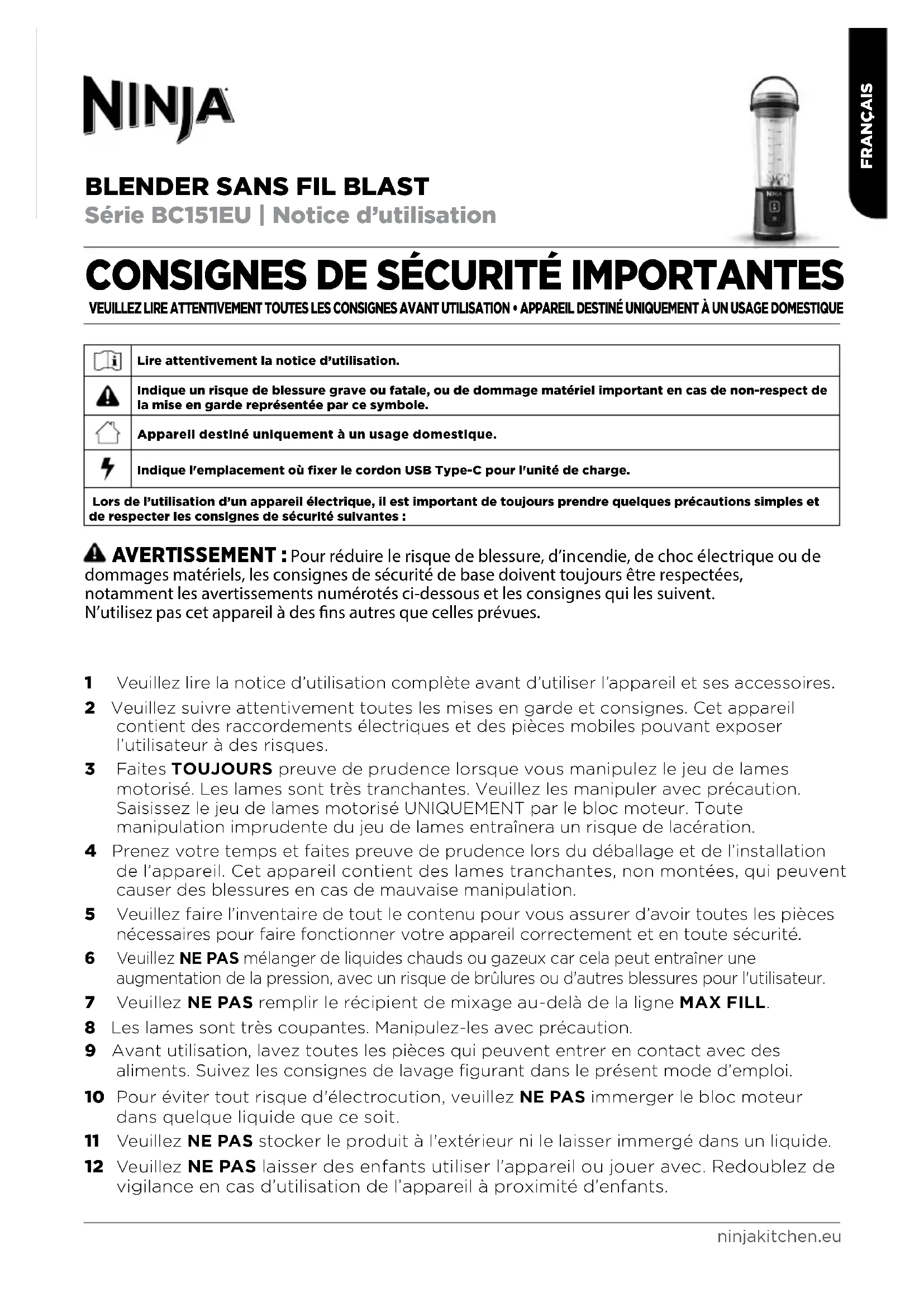 VEUILLEZ LIRE ATTENTIVEMENT TOUTES LES CONSIGNES AVANT UTILISATION • APPAREIL DESTINÉ UNIQUEMENT À UN USAGE DOMESTIQUELire attentivement la notice d’utilisation.Indique un risque de blessure grave ou fatale, ou de dommage matériel important en cas de non-respect de la mise en garde représentée par ce symbole.Appareil destiné uniquement à un usage domestique.Indique l'emplacement où fixer le cordon USB Type-C pour l'unité de charge. Lors de l’utilisation d’un appareil électrique, il est important de toujours prendre quelques précautions simples et de respecter les consignes de sécurité suivantes: FRANÇAISninjakitchen.eu 13 Cet appareil n’est PAS conçu pour être utilisé par des personnes dont les capacités mentales, sensorielles ou physiques sont réduites, ou présentant un manque d’expérience et de connaissances, à moins d’être sous la surveillance ou d’avoir reçu des consignes d’utilisation de l’appareil de la personne responsable de leur sécurité. 14 Avant chaque utilisation, vérifiez que le jeu de lames motorisé n’est pas endommagé. Si une lame est tordue ou si vous soupçonnez des dommages, contactez SharkNinja pour la faire remplacer. 15 Veuillez NE PAS essayer d'aûter les lames. 16 Veuillez NE PAS laisser une quelconque partie de l’appareil entrer en contact avec des surfaces chaudes, notamment les plaques de cuisson et autres appareils chauants. 17 Veuillez TOUJOURS utiliser l’appareil sur une surface sèche et plane. 18 Lors du remplissage et de l’utilisation, gardez les mains, les cheveux et les vêtements à distance du récipient. 19 Veuillez UNIQUEMENT utiliser les pièces et accessoires fournis avec le produit ou recommandés par SharkNinja. L’utilisation d’accessoires non recommandés ou non vendus par SharkNinja peut entraîner des risques d’incendie, de choc électrique ou de blessures. 20 Lors de l'utilisation et de la manipulation de l’appareil, évitez tout contact avec les pièces mobiles. 21 Veuillez NE PAS mettre l’appareil en marche avec un récipient vide. 22 Veuillez NE PAS mettre au four à micro-ondes les récipients ni les accessoires fournis avec l’appareil. 23 Veuillez NE PAS tenter de broyer quoi que ce soit. 24 Avant utilisation, assurez-vous que tous les ustensiles sont retirés des récipients. Des ustensiles oubliés pourraient briser les récipients et entraîner des blessures et des dommages matériels. 25 Veuillez NE PAS tenter de forcer le mécanisme de verrouillage. Assurez-vous que le récipient et le couvercle à bec sont correctement installés avant utilisation. 26 Veuillez NE PAS exposer les récipients et les accessoires à des variations extrêmes de température. Ils pourraient être endommagés. 27 Veuillez NE JAMAIS laisser l’appareil sans surveillance pendant son utilisation. 28 Si des ingrédients non mélangés adhèrent aux parois du gobelet, éteignez l'appareil avec le bouton d’alimentation et utilisez une spatule pour déloger les ingrédients. 29 Veuillez NE PAS tenter de retirer le récipient et le couvercle du bloc moteur lorsque le jeu de lames tourne encore. Attendez que l’appareil s'arrête complètement avant de retirer le couvercle et/ou le récipient. 30 Veuillez NE PAS conserver les ingrédients pendant une période prolongée avant ou après les avoir mixés. Certains aliments peuvent contenir des ingrédients actifs ou dégager des gaz qui se dilatent s'ils sont laissés dans un récipient hermétique, entraînant une augmentation excessive de la pression pouvant présenter un risque de blessure. 31 En cas de surchaue de l’appareil, un interrupteur thermique s’activera et désactivera temporairement le moteur. Pour réinitialiser, ÉTEIGNEZ le mixeur portable Ninja Blast™ à l'aide du bouton d’alimentation et laissez-le refroidir pendant 15minutes avant de l'utiliser à nouveau.