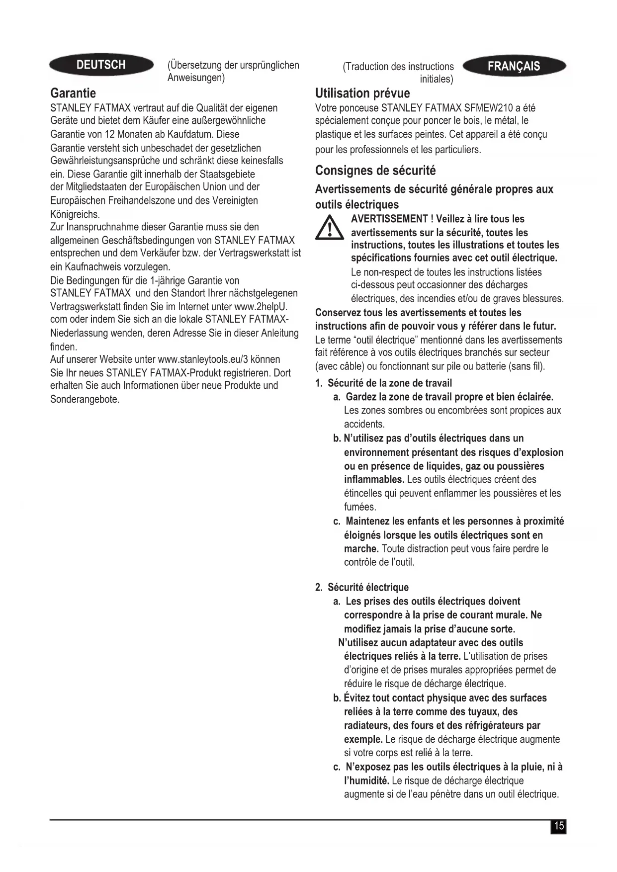 a. Les prises des outils électriques doivent correspondre à la prise de courant murale. Ne modiez jamais la prise d’aucune sorte. N’utilisez aucun adaptateur avec des outils électriques reliés à la terre. L’utilisation de prises d’origine et de prises murales appropriées permet de réduire le risque de décharge électrique. b. Évitez tout contact physique avec des surfaces reliées à la terre comme des tuyaux, des radiateurs, des fours et des réfrigérateurs par exemple. Le risque de décharge électrique augmente si votre corps est relié à la terre. c. N’exposez pas les outils électriques à la pluie, ni à l’humidité. Le risque de décharge électrique augmente si de l’eau pénètre dans un outil électrique. Garantie STANLEY FATMAX vertraut auf die Qualität der eigenen Geräte und bietet dem Käufer eine außergewöhnliche Garantie von 12 Monaten ab Kaufdatum. Diese Garantie versteht sich unbeschadet der gesetzlichen Gewährleistungsansprüche und schränkt diese keinesfalls ein. Diese Garantie gilt innerhalb der Staatsgebiete der Mitgliedstaaten der Europäischen Union und der Europäischen Freihandelszone und des Vereinigten Königreichs. Zur Inanspruchnahme dieser Garantie muss sie den allgemeinen Geschäftsbedingungen von STANLEY FATMAX entsprechen und dem Verkäufer bzw. der Vertragswerkstatt ist ein Kaufnachweis vorzulegen. Die Bedingungen für die 1-jährige Garantie von STANLEY FATMAX und den Standort Ihrer nächstgelegenen Vertragswerkstatt nden Sie im Internet unter www.2helpU. com oder indem Sie sich an die lokale STANLEY FATMAX- Niederlassung wenden, deren Adresse Sie in dieser Anleitung nden. Auf unserer Website unter www.stanleytools.eu/3 können Sie Ihr neues STANLEY FATMAX-Produkt registrieren. Dort erhalten Sie auch Informationen über neue Produkte und Sonderangebote.16 (Traduction des instructions initiales) FRANÇAIS d. Ne tirez pas sur le cordon d’alimentation. N’utilisez jamais le cordon pour transporter, tirer ou débrancher l’outil électrique. Maintenez le cordon à l’écart de la chaleur, des substances grasses, des bords tranchants ou des pièces mobiles. Les cordons endommagés ou emmêlés augmentent le risque de décharge électrique. e. Si vous utilisez un outil électrique à l’extérieur, utilisez une rallonge homologuée pour les travaux extérieurs. L’utilisation d’une rallonge électrique homologuée pour les travaux en extérieur réduit le risque de décharge électrique. f. Si l’utilisation d’un outil électrique dans un endroit humide est inévitable, utilisez une alimentation électrique protégée par un disjoncteur différentiel à courant résiduel (DDR). L’utilisation d’un DDR réduit le risque de décharge électrique.