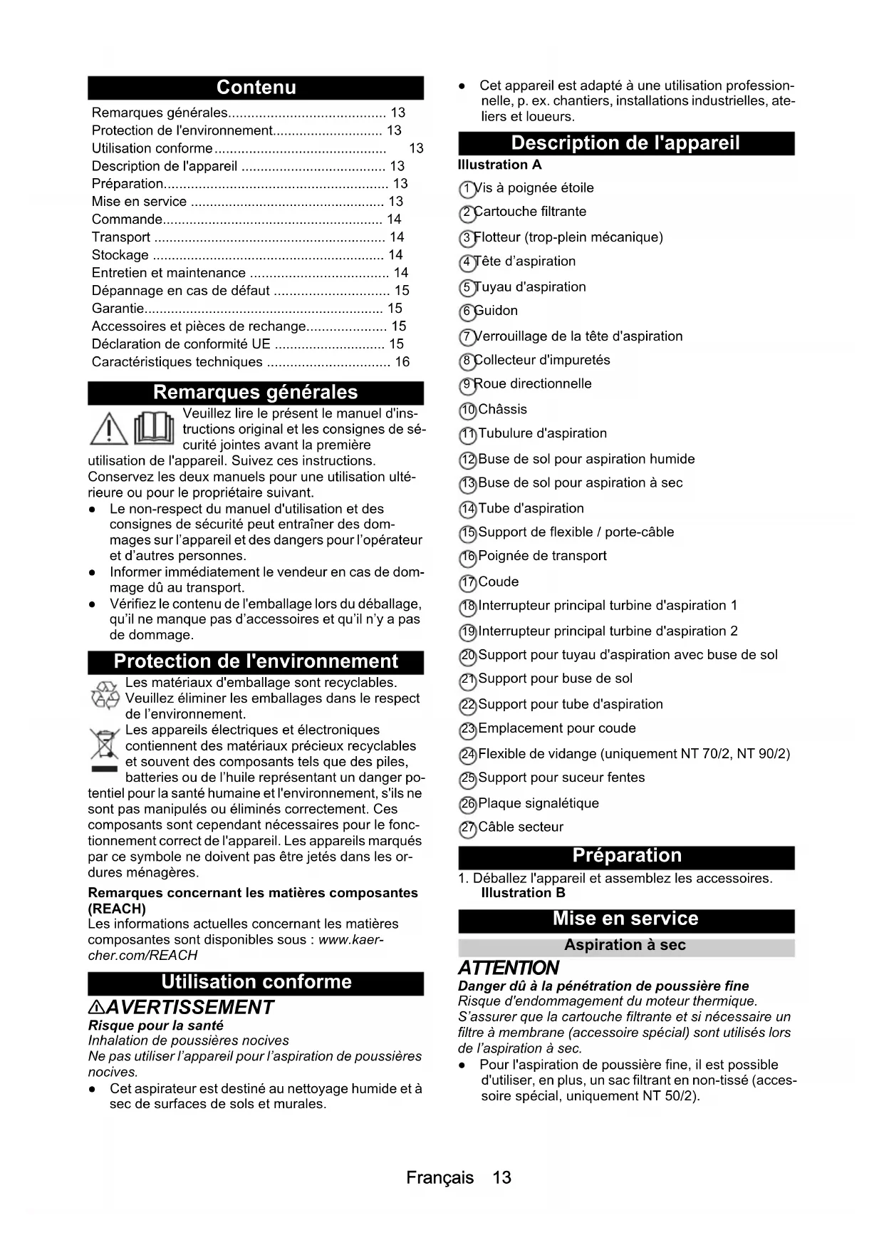 H05VV-F 2x1,0 H05VV-F 2x1,0 H05VV-F 2x1,0 Part number (EU) 9.770-933.0 9.770-933.0 9.770-933.0 Cable length m 7,5 7,5 7,5Français 13 Contenu Remarques générales Veuillez lire le présent le manuel d'ins- tructions original et les consignes de sé- curité jointes avant la première utilisation de l'appareil. Suivez ces instructions. Conservez les deux manuels pour une utilisation ulté- rieure ou pour le propriétaire suivant. ● Le non-respect du manuel d'utilisation et des consignes de sécurité peut entraîner des dom- mages sur l’appareil et des dangers pour l’opérateur et d’autres personnes. ● Informer immédiatement le vendeur en cas de dom- mage dû au transport. ● Vérifiez le contenu de l'emballage lors du déballage, qu’il ne manque pas d’accessoires et qu’il n’y a pas de dommage. Protection de l'environnement Les matériaux d'emballage sont recyclables. Veuillez éliminer les emballages dans le respect de l’environnement. Les appareils électriques et électroniques contiennent des matériaux précieux recyclables et souvent des composants tels que des piles, batteries ou de l’huile représentant un danger po- tentiel pour la santé humaine et l'environnement, s'ils ne sont pas manipulés ou éliminés correctement. Ces composants sont cependant nécessaires pour le fonc- tionnement correct de l'appareil. Les appareils marqués par ce symbole ne doivent pas être jetés dans les or- dures ménagères. Remarques concernant les matières composantes (REACH) Les informations actuelles concernant les matières composantes sont disponibles sous : www.kaer- cher.com/REACH Utilisation conforme 몇 AVERTISSEMENT Risque pour la santé Inhalation de poussières nocives Ne pas utiliser l’appareil pour l’aspiration de poussières nocives. ● Cet aspirateur est destiné au nettoyage humide et à sec de surfaces de sols et murales. ● Cet appareil est adapté à une utilisation profession- nelle, p. ex. chantiers, installations industrielles, ate- liers et loueurs. Description de l'appareil Illustration A 1 Vis à poignée étoile 2 Cartouche filtrante 3 Flotteur (trop-plein mécanique) 4 Tête d’aspiration 5 Tuyau d'aspiration 6 Guidon 7 Verrouillage de la tête d'aspiration 8 Collecteur d'impuretés 9 Roue directionnelle 10 Châssis 11 Tubulure d'aspiration 12 Buse de sol pour aspiration humide 13 Buse de sol pour aspiration à sec 14 Tube d'aspiration 15 Support de flexible / porte-câble 16 Poignée de transport 17 Coude 18 Interrupteur principal turbine d'aspiration 1 19 Interrupteur principal turbine d'aspiration 2 20 Support pour tuyau d'aspiration avec buse de sol 21 Support pour buse de sol 22 Support pour tube d'aspiration 23 Emplacement pour coude 24 Flexible de vidange (uniquement NT 70/2, NT 90/2) 25 Support pour suceur fentes 26 Plaque signalétique 27 Câble secteur Préparation