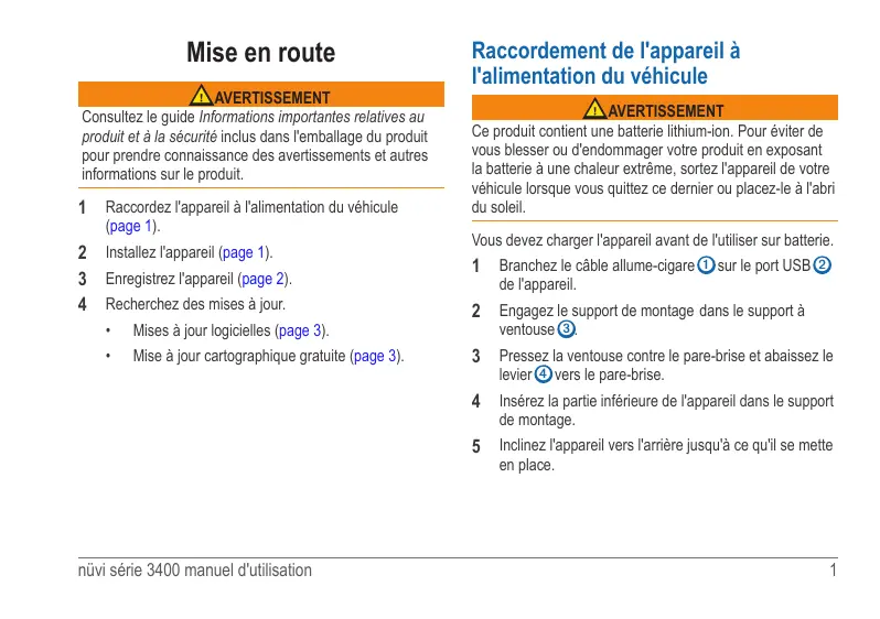 Mise en route AVERTISSEMENT onsultez le guide Informations importantes relatives au C produit et à la sécurité inclus dans l'emballage du produit pour prendre connaissance des avertissements et autres informations sur le produit. 1 Raccordez l'appareil à l'alimentation du véhicule (page 1).