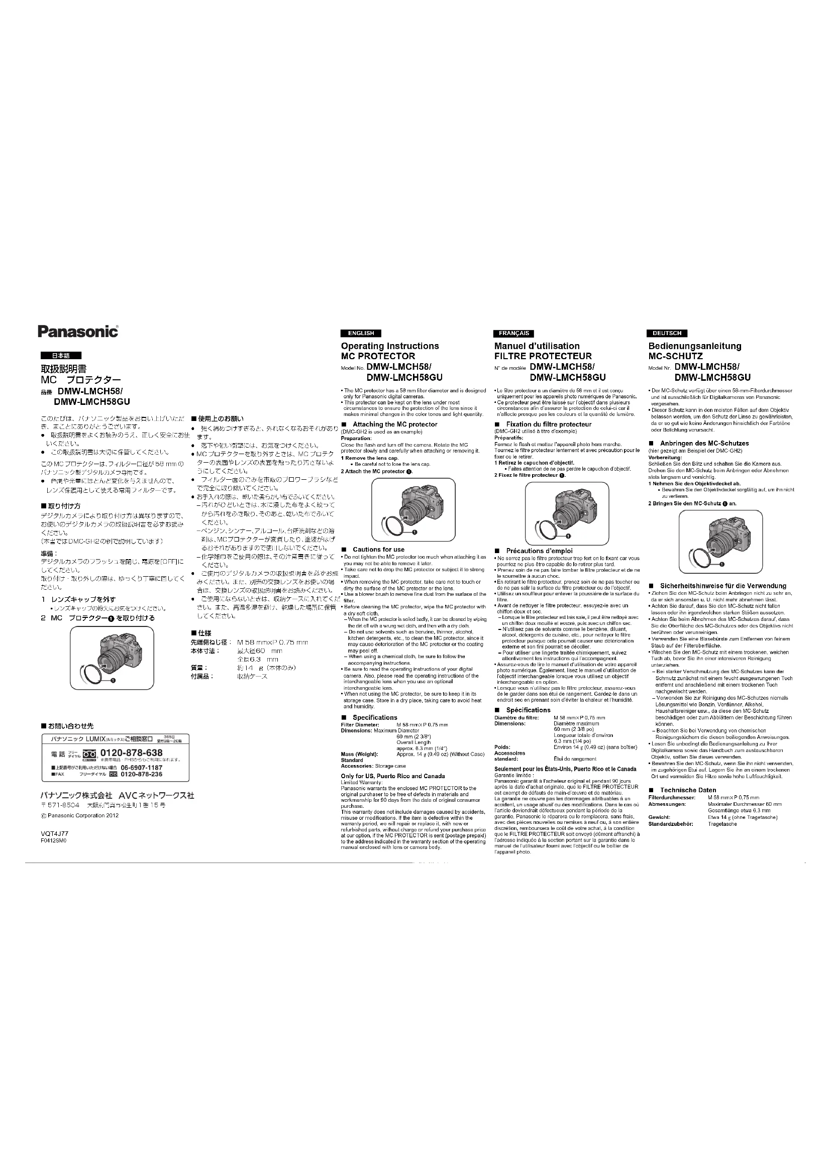 - Lorsque vous n’utilisez pas le filtre protecteur, assurez-vous de le garder dans son étui de rangement. Gardez-le dans un endroit sec en prenant soin d’éviter la chaleur et l’humidité. ∫ Spécifications Diamètre du filtre: M58mmkP0,75mm Dimensions: Diamètre maximum 60 mm (2 3/8 po)Longueur totale d’environ 6,3 mm (1/4 po) Poids: Environ 14 g (0,49 oz) (sans boîtier) Accessoires standard: Étui de rangementSeulement pour les États-Unis, Puerto Rico et le CanadaGarantie limitée :Panasonic garantit à l’acheteur original et pendant 90 jours après la date d’achat originale, que le FILTRE PROTECTEUR est exempt de défauts de main-d’œuvre et de matériau.La garantie ne couvre pas les dommages attribuables à un accident, un usage abusif ou des modifications. Dans le cas où l’article deviendrait défectueux pendant la période de la garantie, Panasonic le réparera ou le remplacera, sans frais, avec des pièces nouvelles ou remises à neuf ou, à son entière discrétion, remboursera le coût de votre achat, à la condition que le FILTRE PROTECTEUR soit envoyé (dûment affranchi) à l’adresse indiquée à la section portant sur la garantie dans le manuel de l’utilisateur fourni avec l’objectif ou le boîtier de l’appareil photo. Bedienungsanleitung MC-SCHUTZ Model Nr. DMW-LMCH58/ DMW-LMCH58GU