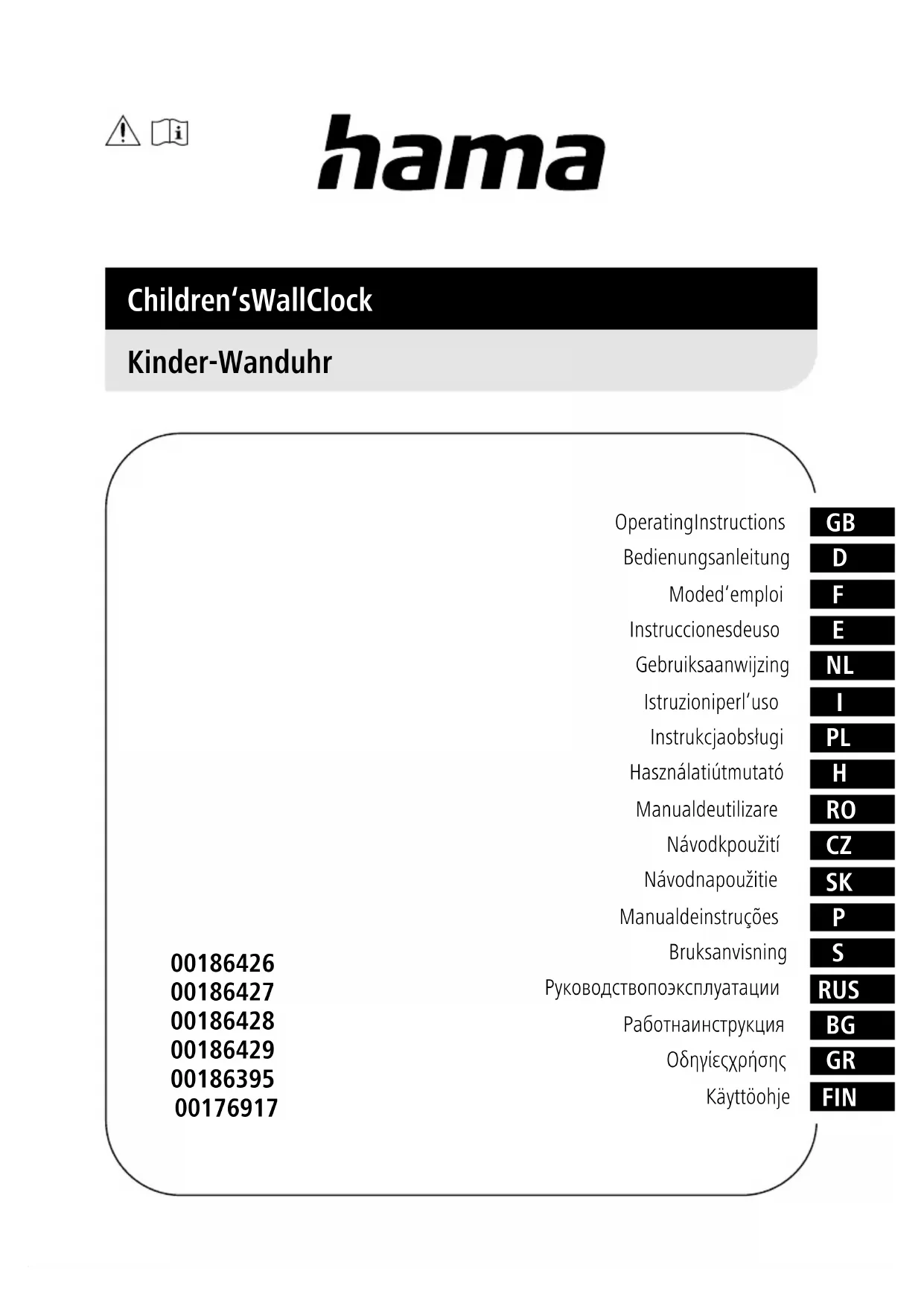 Kinder-Wanduhr Stromversorgung 1,5 V 1 x AA Batterie4 F Mode d‘emploi Nous vous remercions d’avoir choisi un produit Hama. Veuillez prendre le temps de lire l‘ensemble des remarques et consignes suivantes. Veuillez conserver ce mode d‘emploi à portée de main an de pouvoir le consulter en cas de besoin. Transmettez-le au nouveau propriétaire avec l’appareil le cas échéant.