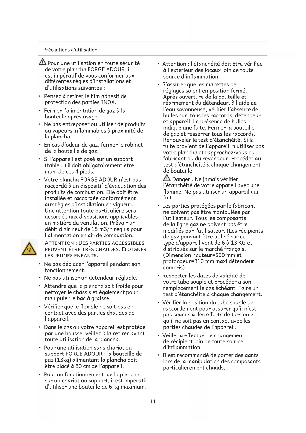 Le gaz n’arrive pas Bouteille de gaz vide Changer de bouteille de gaz Détendeur défectueux Changer le détendeur Détendeur non amorcé Amorcer le détendeur Robinet du détendeur en position fermé Ouvrir le robinet du détendeur Pas d’étincelle lorsque j’allume ma plancha Pile défectueuse (suivant modèle) Changer la pile Pile dans le mauvais sens Vérier le sens de la pile Le exible ne se raccorde pas à la plancha Flexible non homologué Remplacer le exible par un modèle homologué (voir cha- pitre “branchement de gaz”). Le sens de raccordement du exible est incorrect Vérier le sens du exible Défaut d’écoulement de graisse Défaut d’inclinaison de la plaque Régler l’inclinaison de la pla- que de cuisson à l’aide des vis de réglage (suivant modèle). Vérier que la plancha ou son support soient bien de niveau. Défaut de positionnement du bac à graisse Vérier le positionnement de votre bac à graisse. Si malgré les recommandations votre problème persiste, veuillez contacter votre distributeur.17 Precautions for use To ensure safe use of your FORGE ADOUR plancha, it is essential to comply