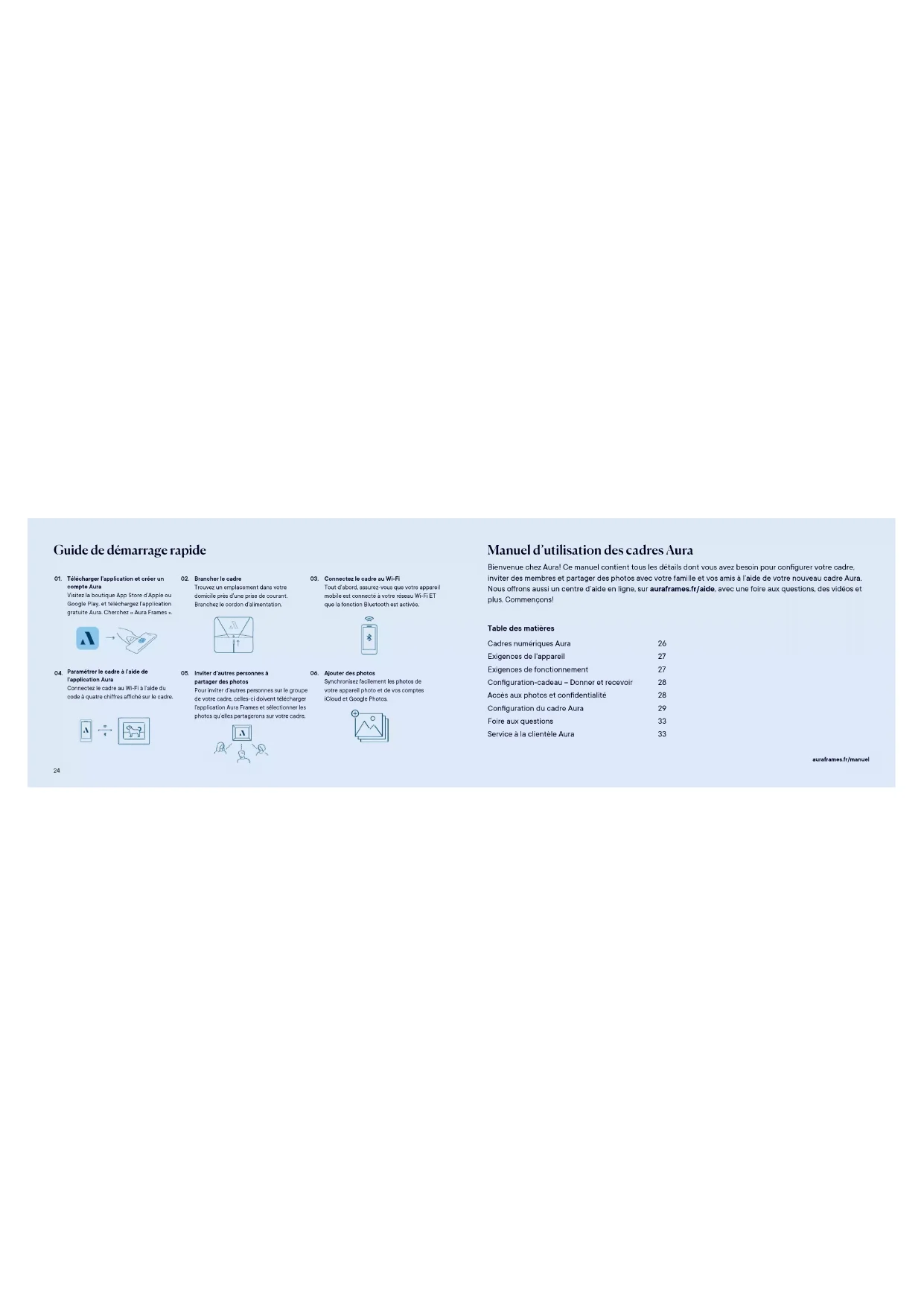 Bienvenue chez Aura! Ce manuel contient tous les détails dont vous avez besoin pour congurer votre cadre, inviter des membres et partager des photos avec votre famille et vos amis à l’aide de votre nouveau cadre Aura. Nous offrons aussi un centre d’aide en ligne, sur auraframes.fr/aide, avec une foire aux questions, des vidéos et plus. Commençons! Guide de démarrage rapide Télécharger l’application et créer un compte Aura Visitez la boutique App Store d’Apple ou Google Play, et téléchargez l’application gratuite Aura. Cherchez «Aura Frames». Paramétrer le cadre à l’aide de l’application Aura Connectez le cadre au Wi-Fi à l’aide du code à quatre chiffres affiché sur le cadre. Brancher le cadre Trouvez un emplacement dans votre domicile près d’une prise de courant. Branchez le cordon d’alimentation. Inviter d’autres personnes à partager des photos Pour inviter d’autres personnes sur le groupe de votre cadre, celles-ci doivent télécharger l’application Aura Frames et sélectionner les photos qu’elles partagerons sur votre cadre. Connectez le cadre au Wi-Fi Tout d’abord, assurez-vous que votre appareil mobile est connecté à votre réseau Wi-Fi ET que la fonction Bluetooth est activée. Ajouter des photos Synchronisez facilement les photos de votre appareil photo et de vos comptes iCloud et Google Photos.